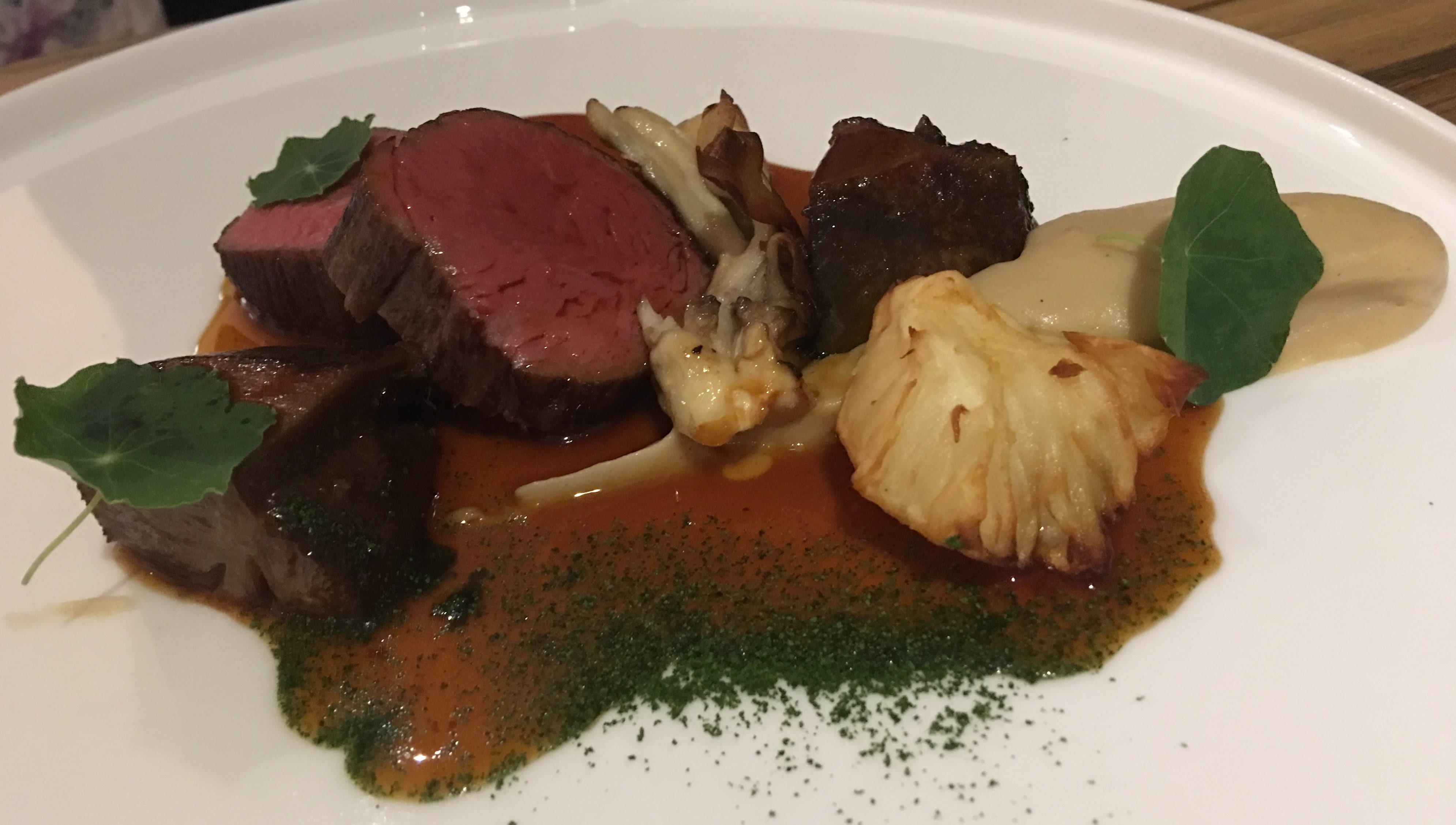 Our next dish, which we both got, was Beef Two Ways. A grilled Shoulder Tender and then a braised tender. With Celeriac Cream, Roasted Celeriac and Mushroom, a garnish leaf with a Wasabi-like kick to it and finished off by Chef Stephan pouring a Red Wine sauce on it at tableside.