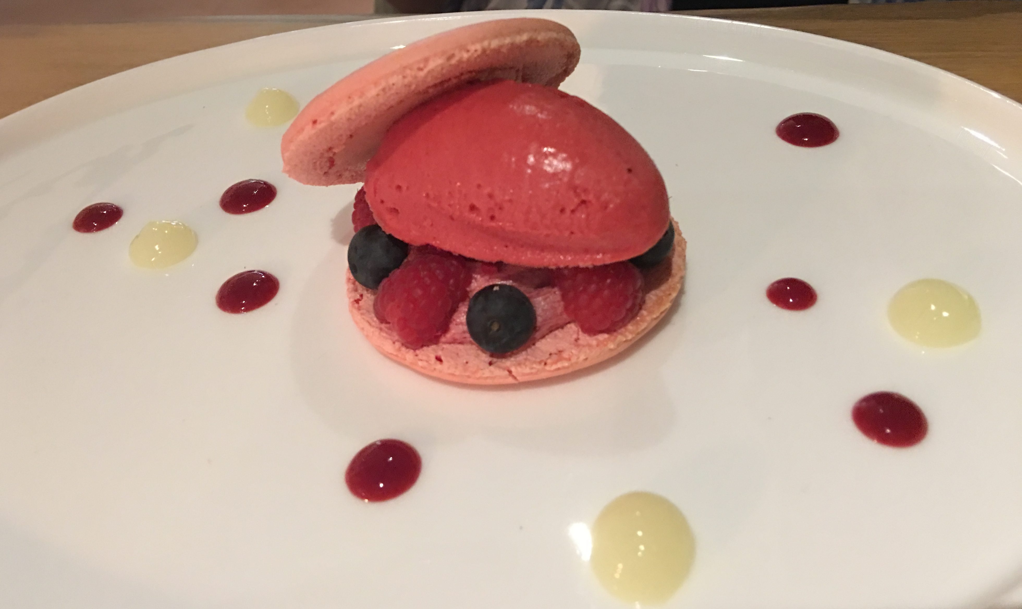 Since Lena did not want chocolate, she got a Raspberry Macaroon with Raspberry Sorbet, fruits and Raspberry Sauce and Yuzu Sauce. Wow, the flavors were sharp and fresh. So awesome.