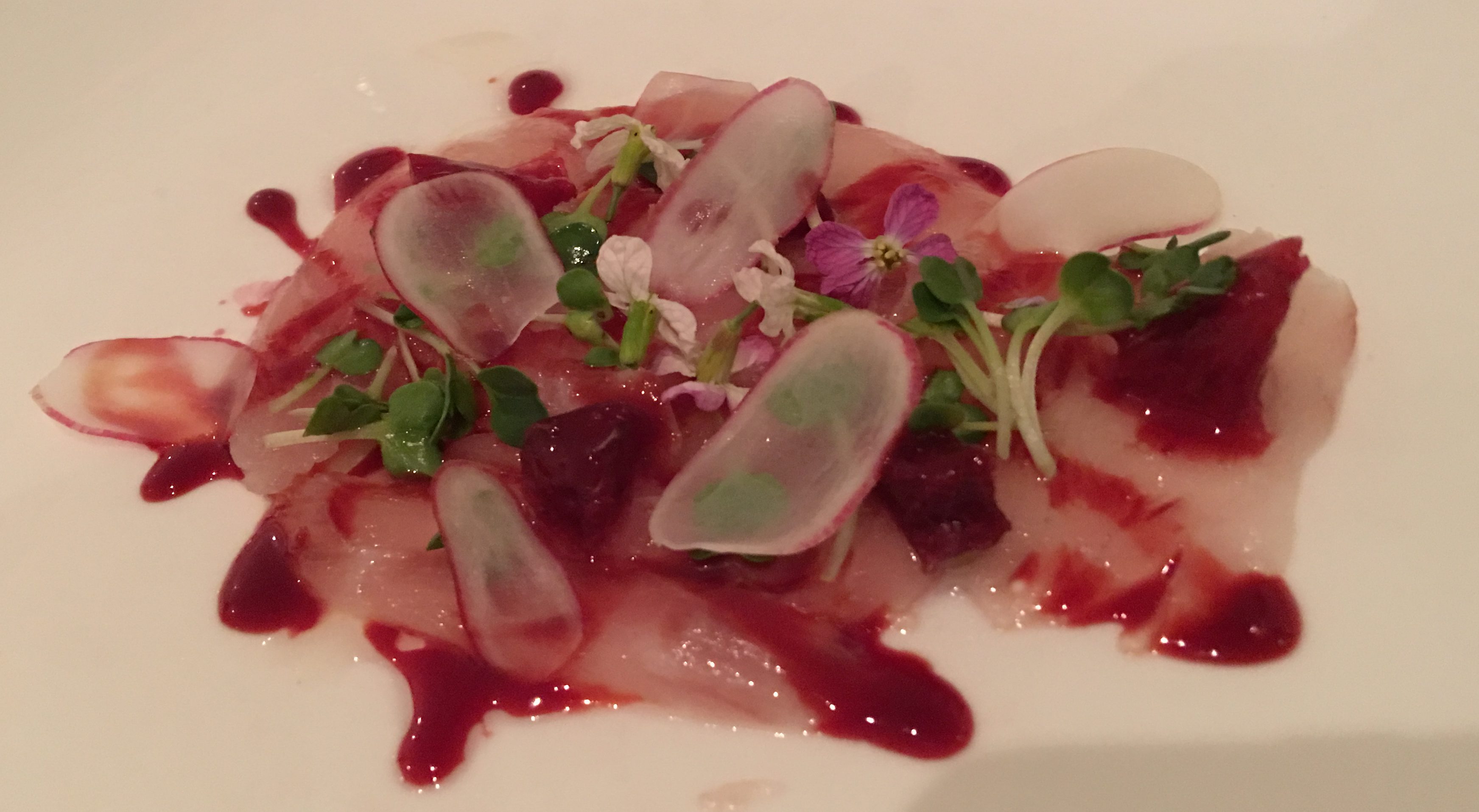 I started with the Baja Striped Bass Crudo. Along with Heirloom Radish, Blood Orange, Ginger Oil, Radish Sprouts and Blossoms, it looked fantastic when presented.