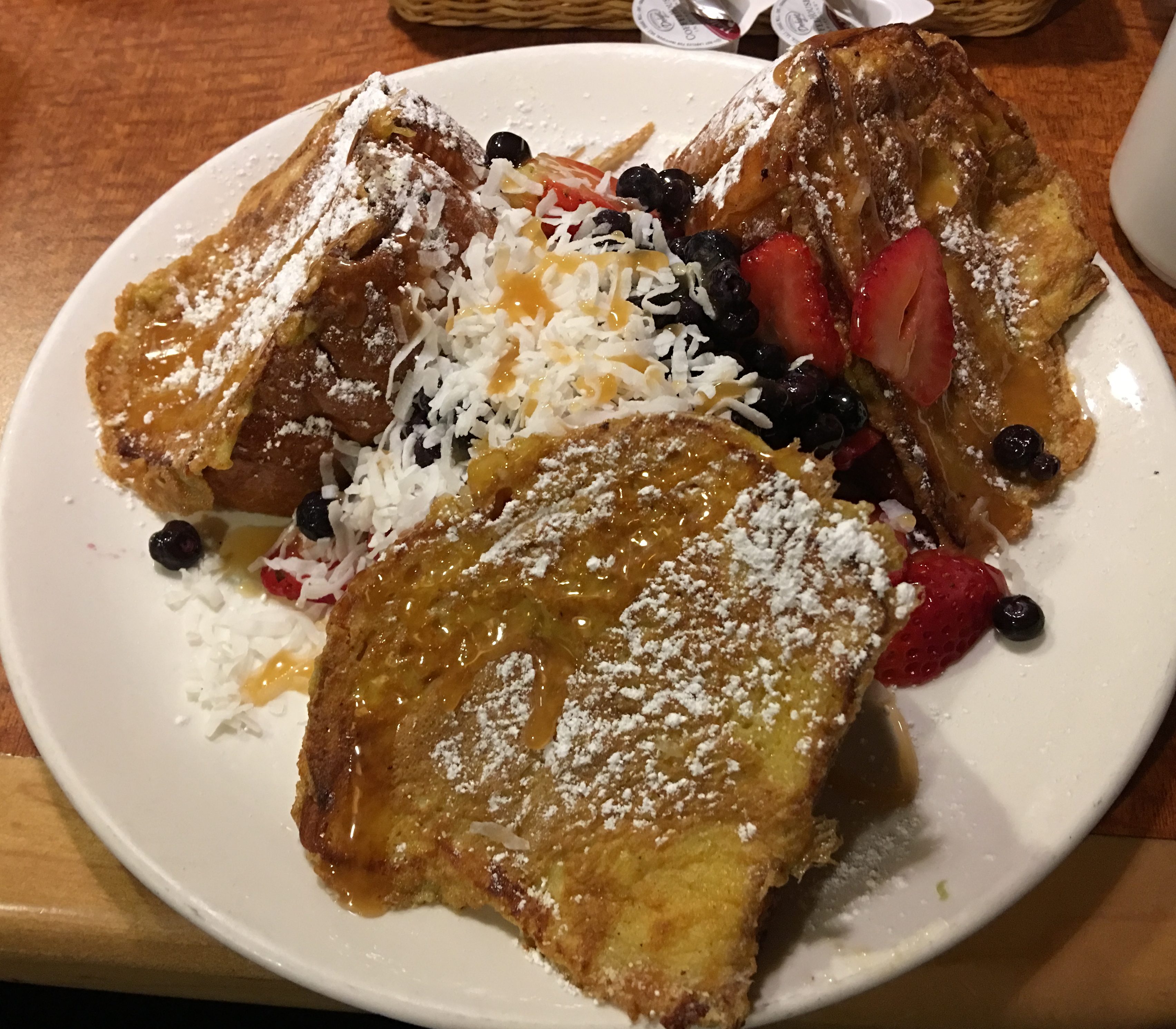The first is Tiki Toast.  It is French Toast using Hawaiian Sweet Bread, with Toasted Coconut, Caramel and Fruits.