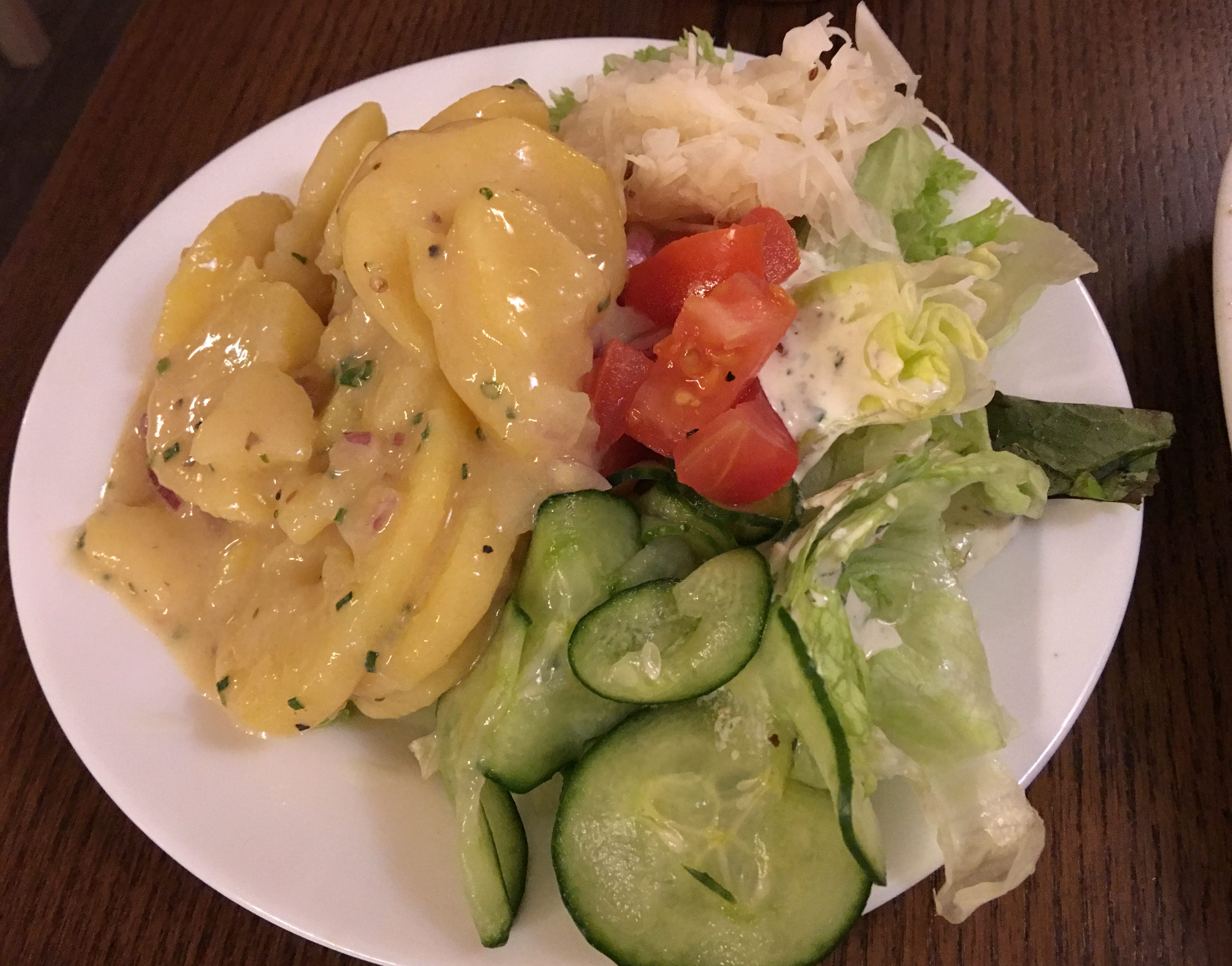 First came the side plate of salads. I do like the cucumber and lettuce salads. The potato salad I used to like, but it’s just too heavy to go with everything else.