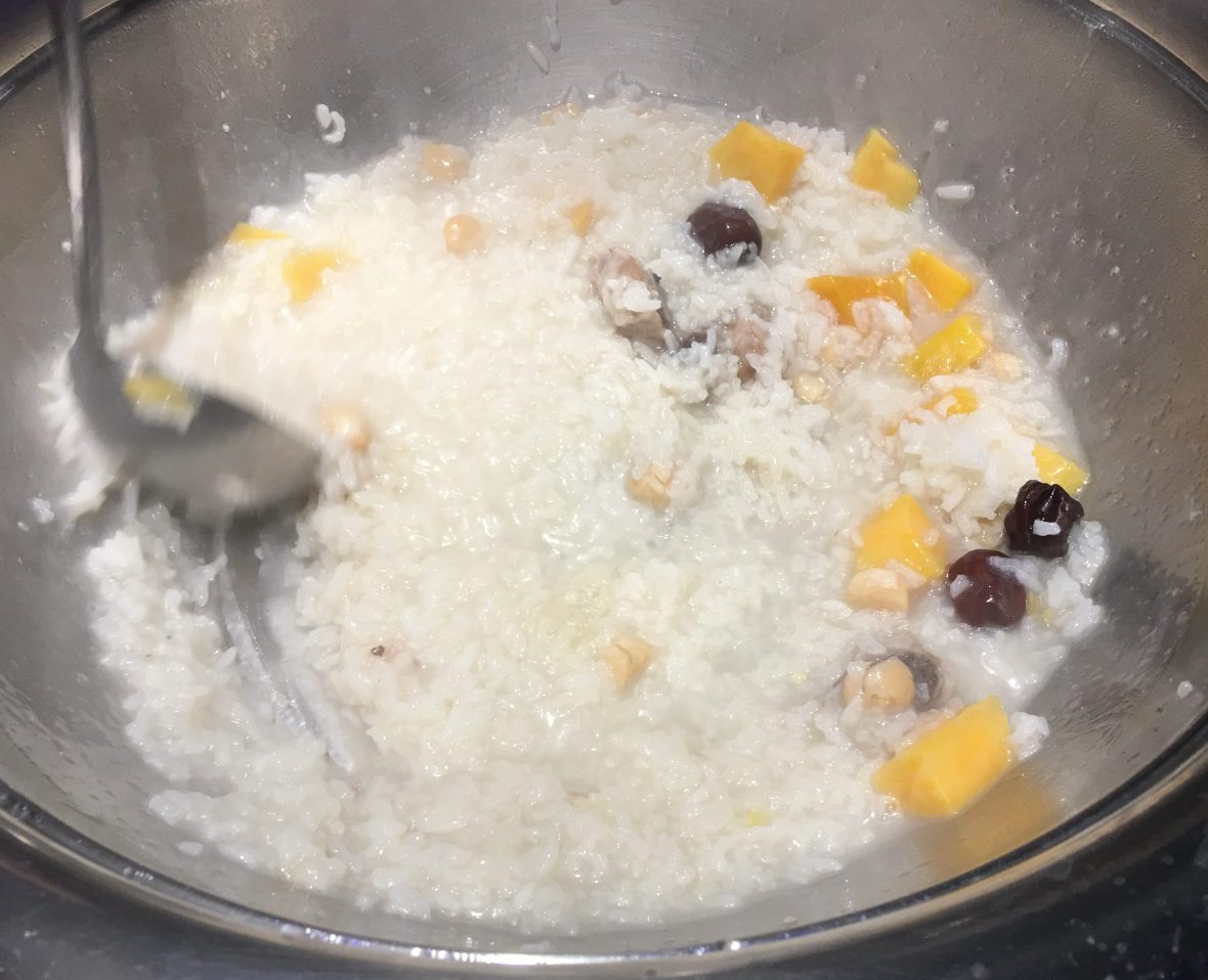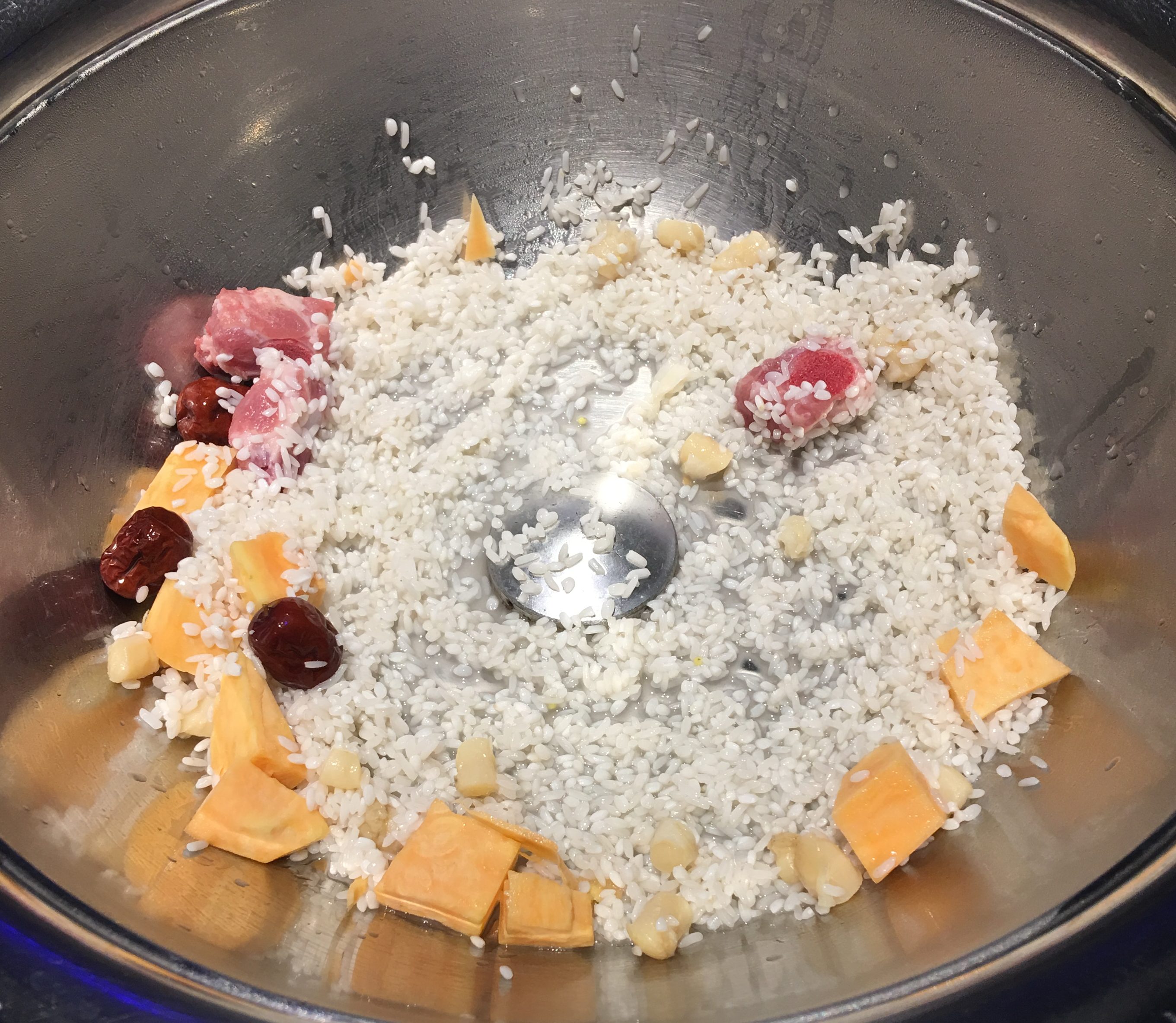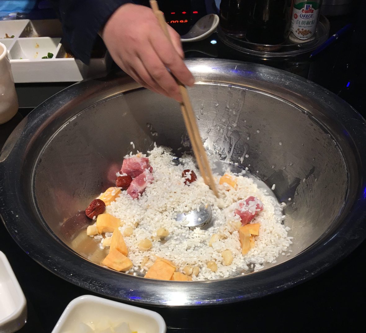 The first thing they do with the steamer is take the plates out and in the bottom, they mix rice, sweet potato, pork and other items.