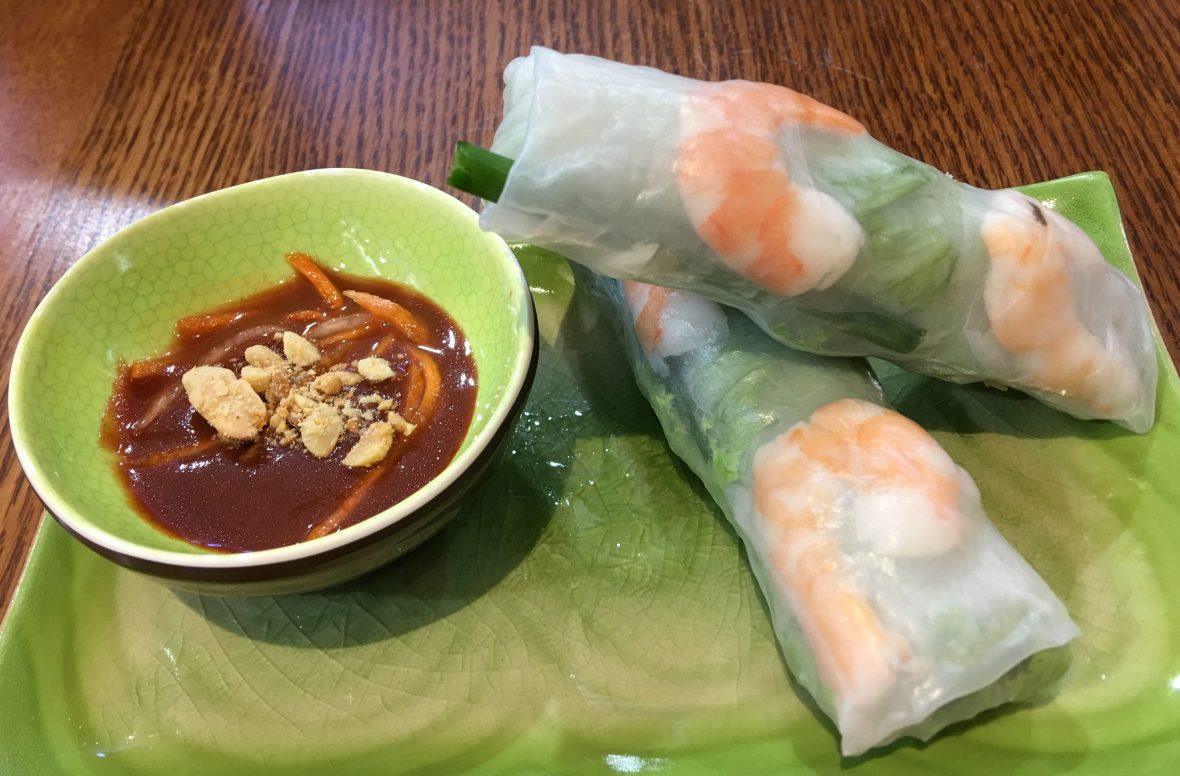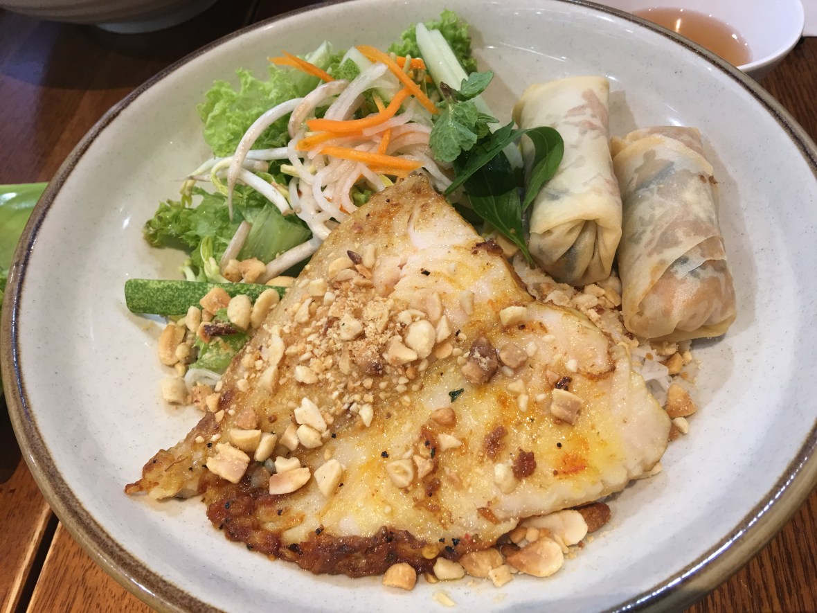 Started off with a Prawn Roll.  Fresh and not bad. Summer Roll.  A little different than the Prawn Roll. How about dishes?  Here is Grilled Fish on Vermicelli with Spring Roll.  The fish was good, the rest was so-so. Beef Pho.  No flavor in the broth at all, what a let down.Touristy at best.