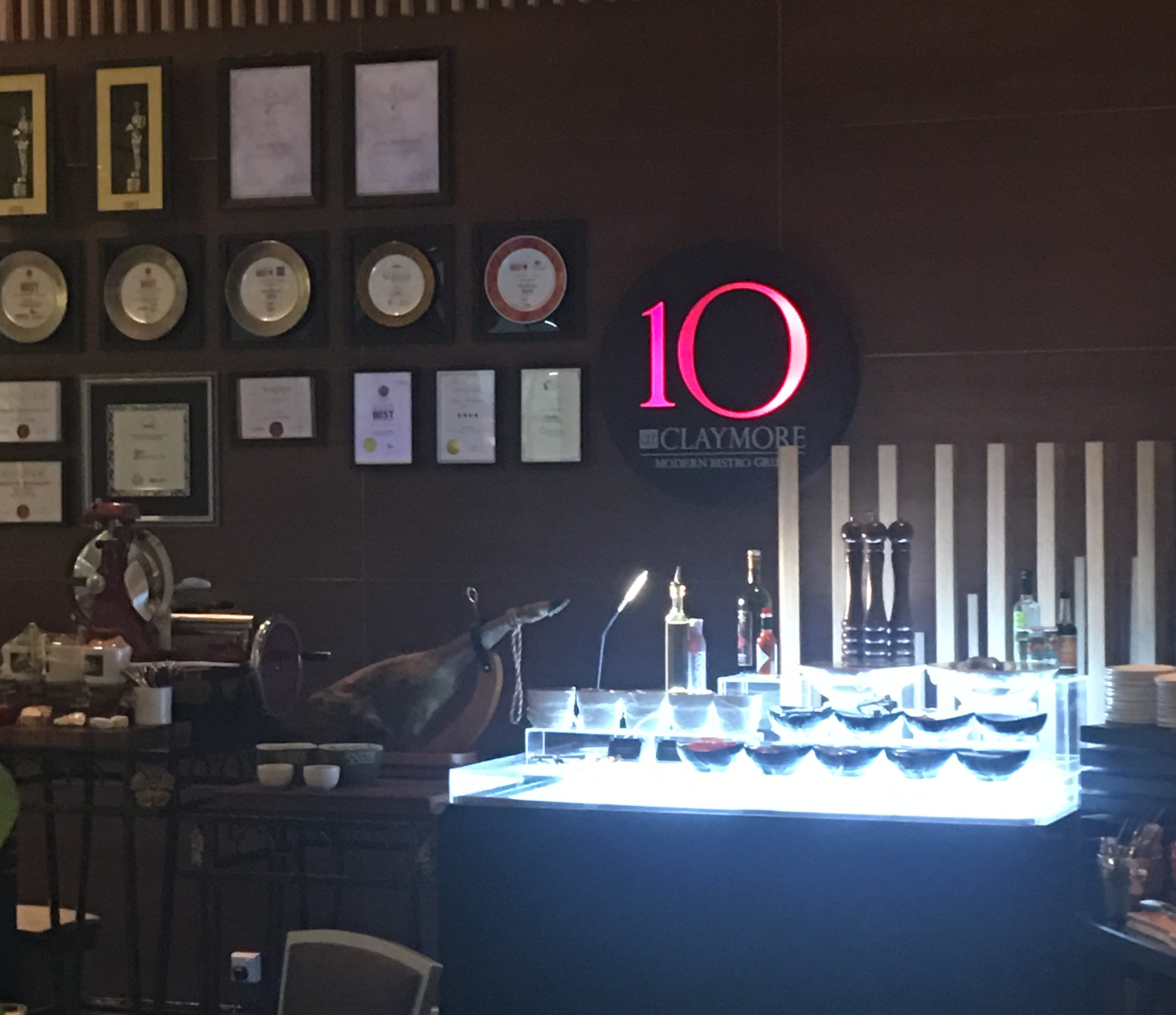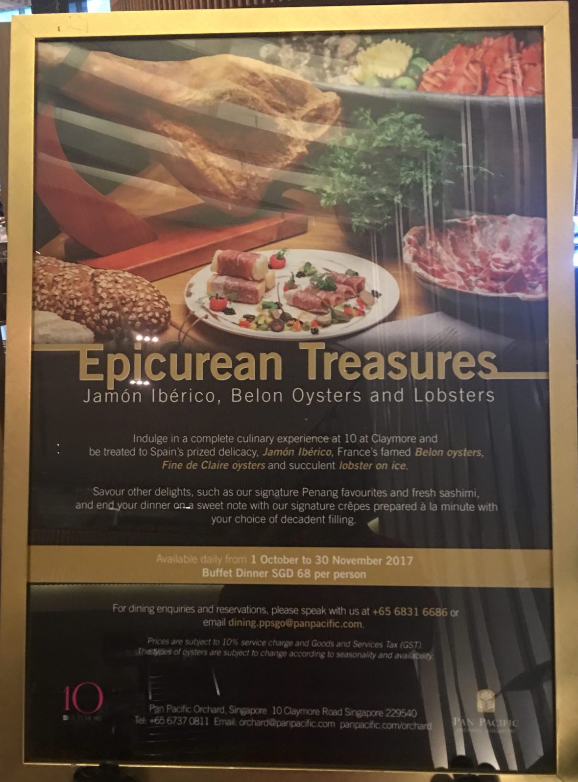 10 at Claymore is the lobby restaurant at the Pan Pacific Orchard. What they have is a buffet theme that lasts for 2 months and each one is different. We wanted to try their Waygu and Lobster Buffet, but it was sold out totally for when we wanted to go. So we decided to head there for Lena’s birthday buffet and the theme was Iberico Ham, Oysters and Lobsters Buffet. We are there!