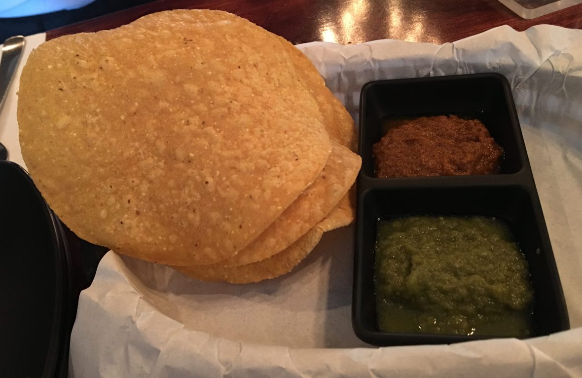 I got a basket of chips. But the chips are the size of frisbees. Interesting for sure. The Salsa dips were interesting, with the red being a nice sizzling hot and the green a little meh.