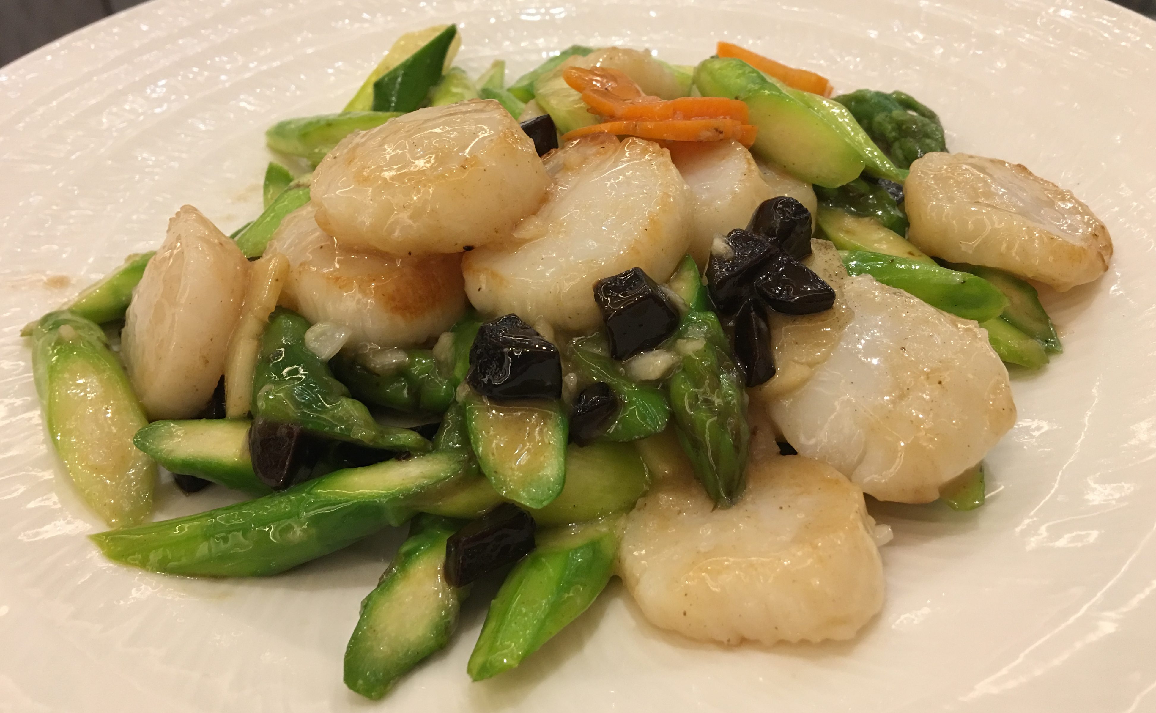 Scallops with Asparagus and Black Garlic. I had no idea it was Black Garlic, I thought it was licorice! Fresh and seasoned nicely.
