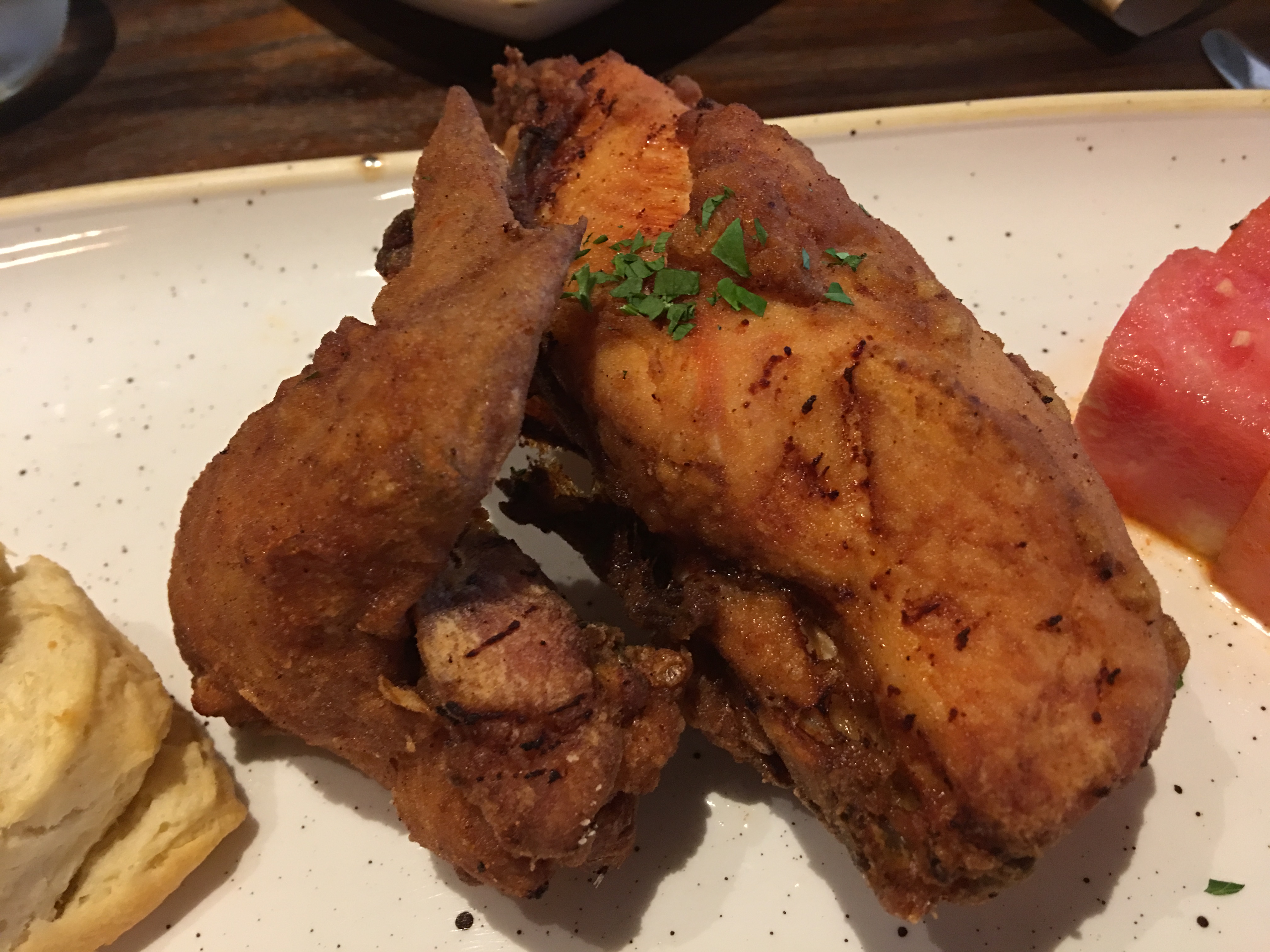The chicken was pretty well seasoned, you could taste the brine marinade that it was soaked in. The skin was crisp and the meat was juicy. I tried it a bit with the Honey Hot Sauce. That was basically Buffalo Wing sauce.