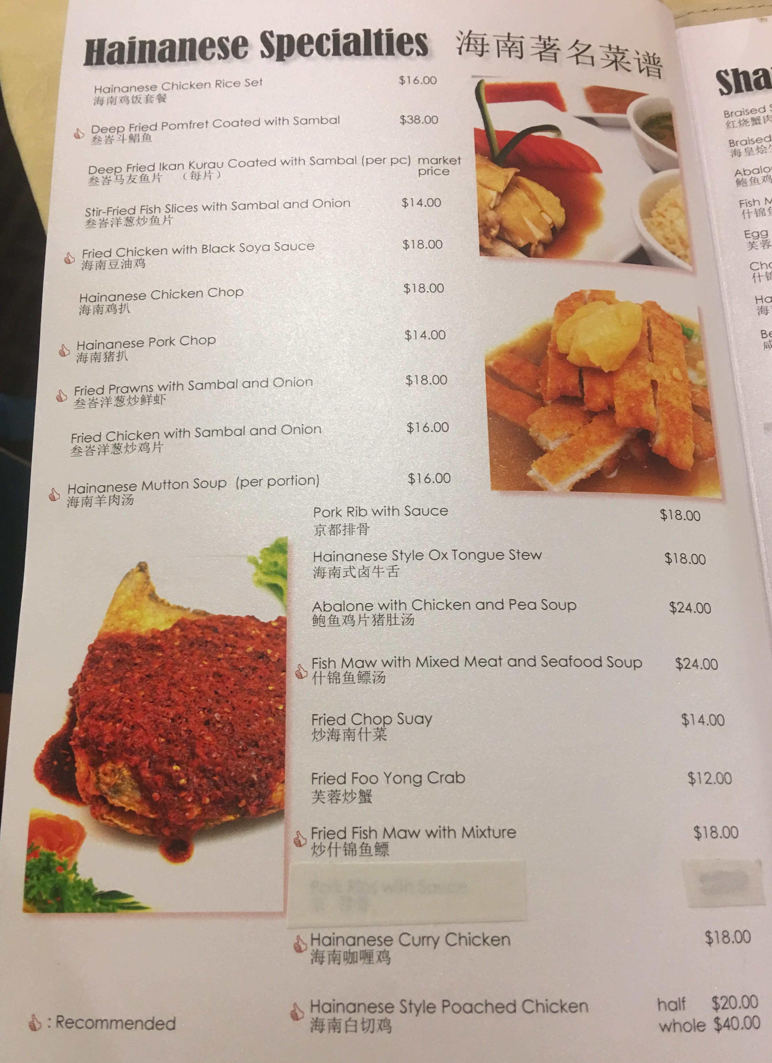 They do have a menu of Hainanese specialties and we tried it as my MIL is Hainanese and we wanted to get her some of the food she remembers.
