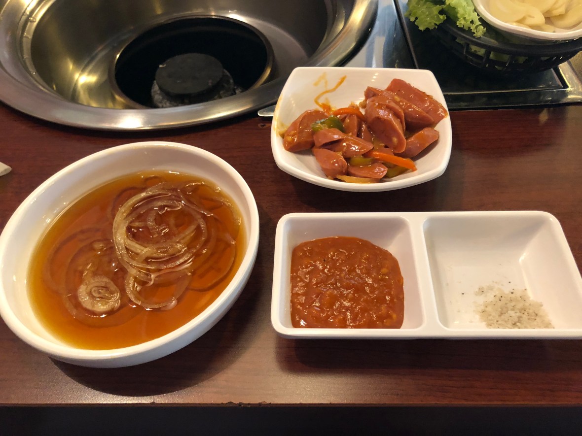 After we ordered all of the Banchan and accompaniments came. Here we have some Sausages and also the Dipping Sauce and Bean Paste for the BBQ.