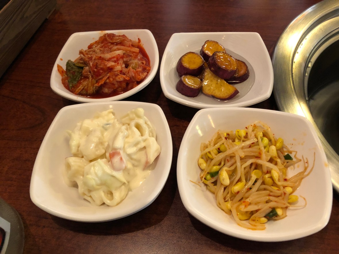 More Banchan – Kimchi, Honeyed Sweet Potatoes, Spicy Bean Sprouts and a Pasta Salad.