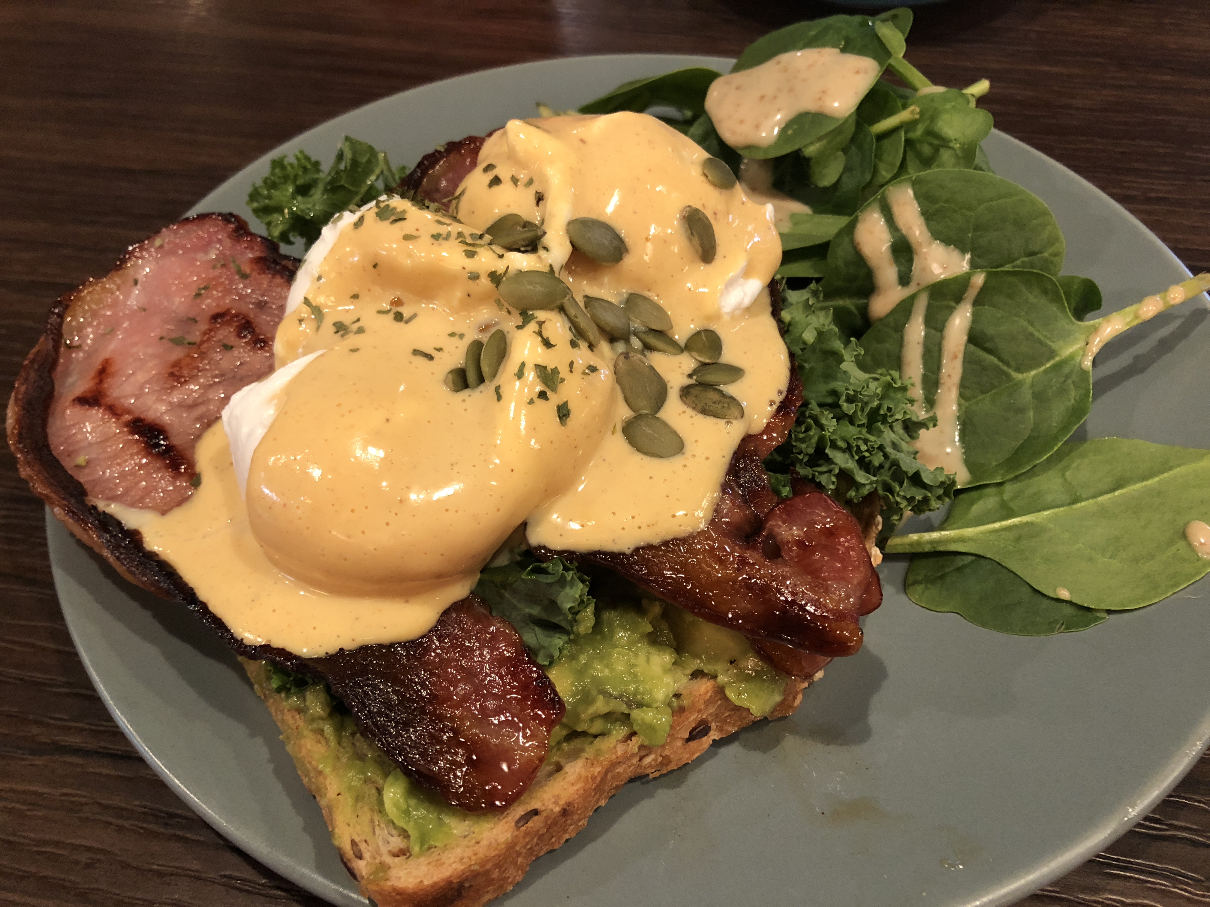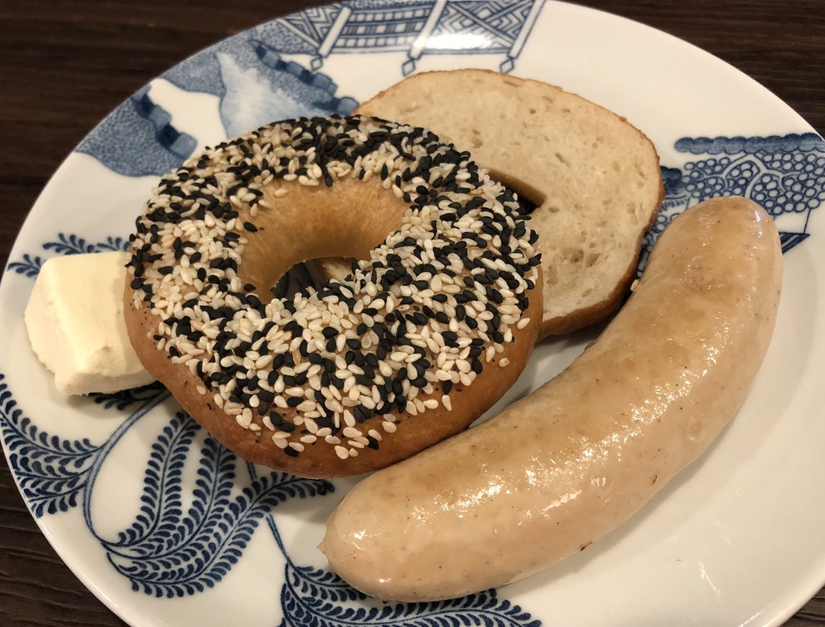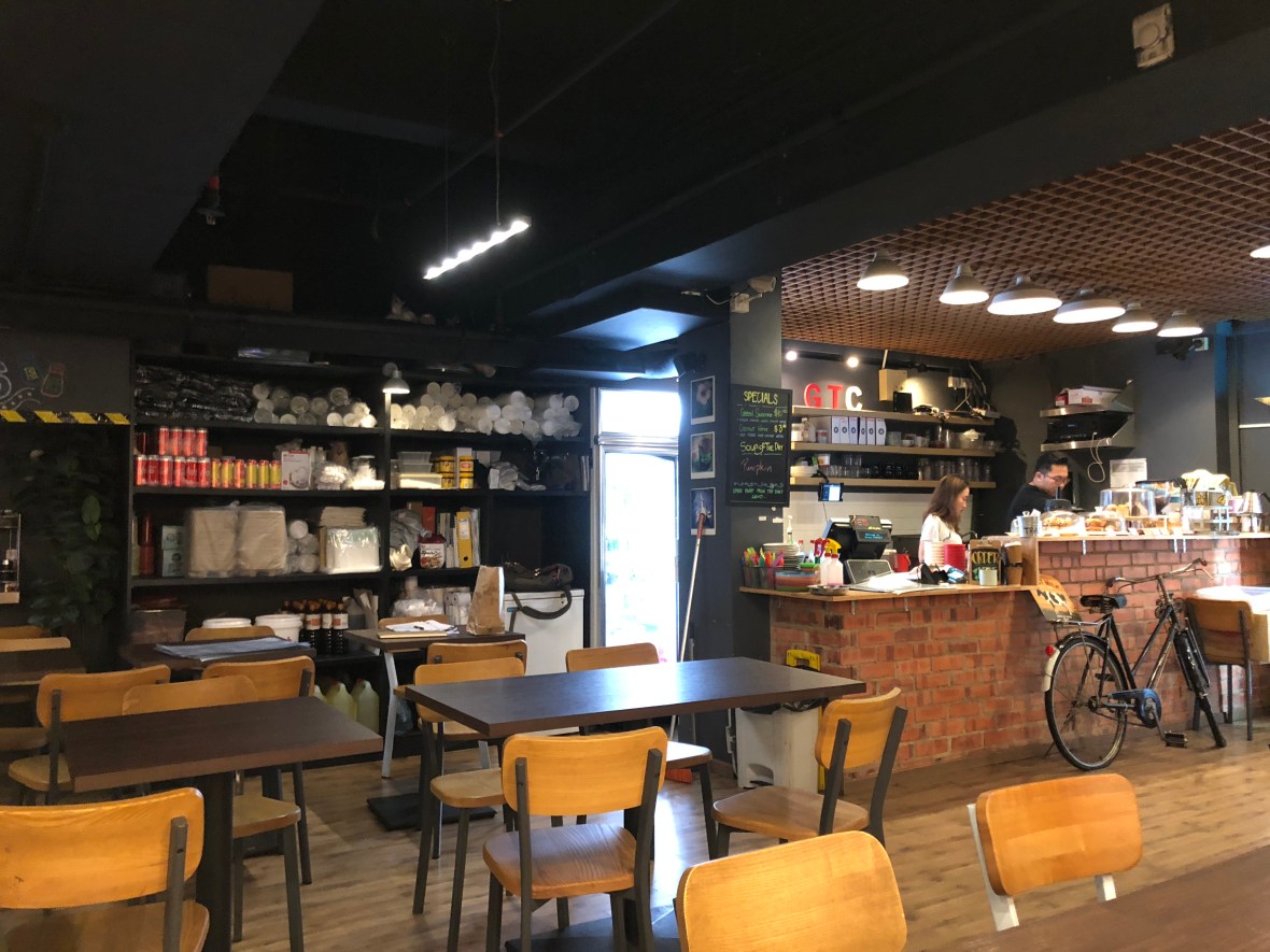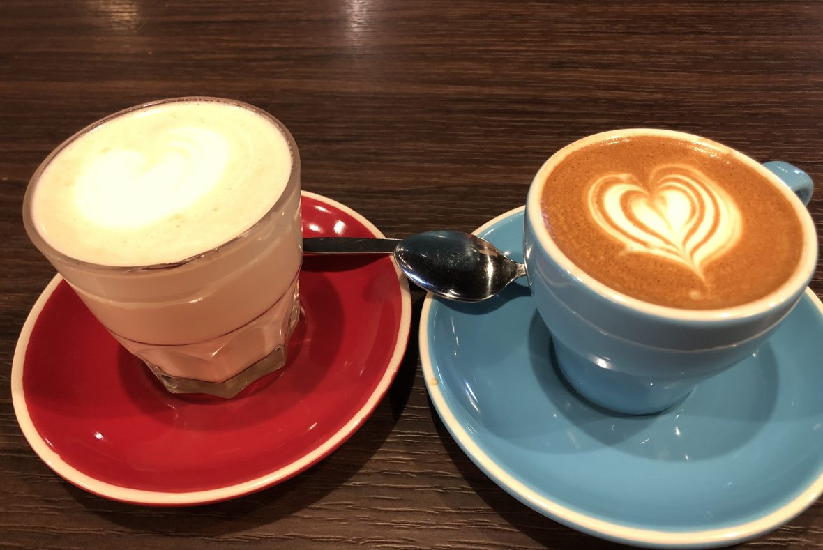 The menu is pretty expansive with some interesting items. Let’s start out with Coffee!  Gula Melaka Latte and a Flat White!For the missus a Bratwurst and a Bagel. Skinny Benedict.  This one has Kale and Avocado, but I replaced the Smoked Salmon with Bacon.  Not really so skinny…Great little cafe with good coffee, food and ambience.  A nice start to the day!