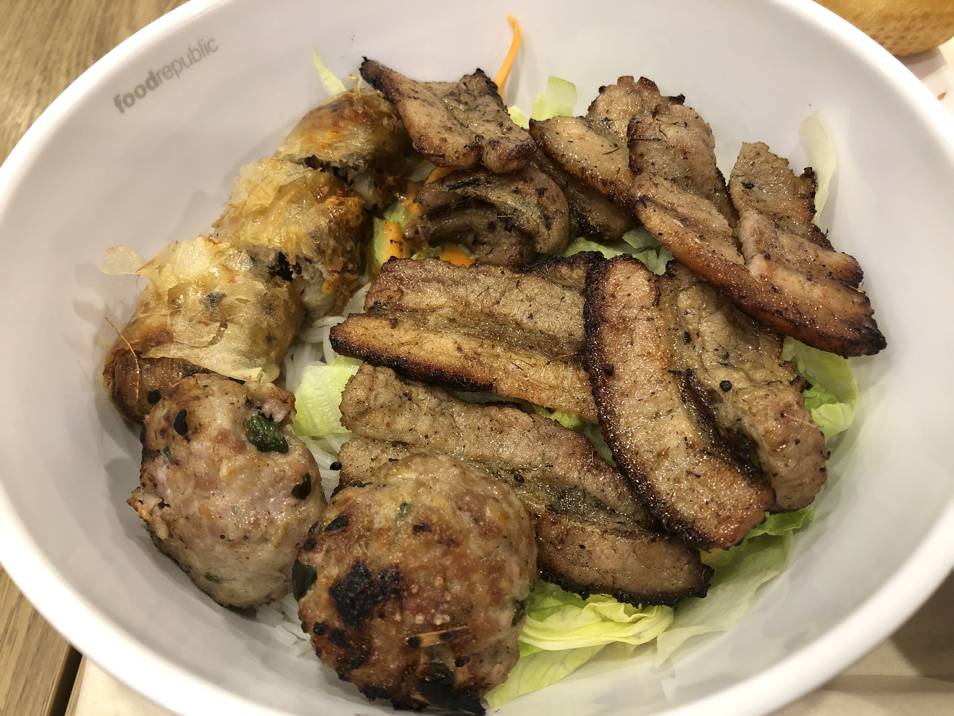 When you look at the menu, if you blink, you’ll miss the little placard that advertises bún thịt nướng chả giò, or the BBQ Pork with Rice Vermicelli. Get it.