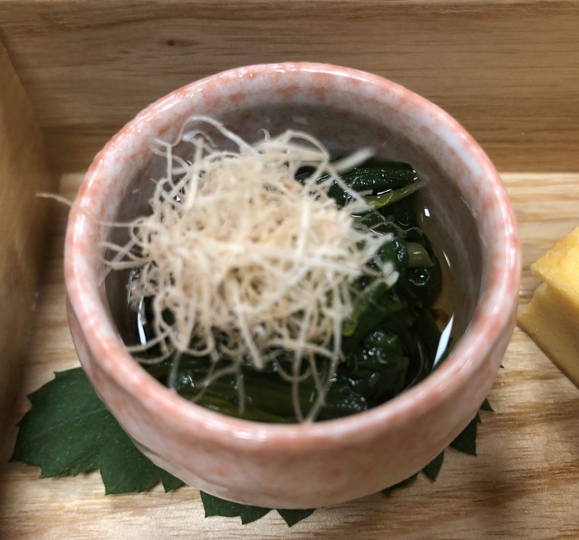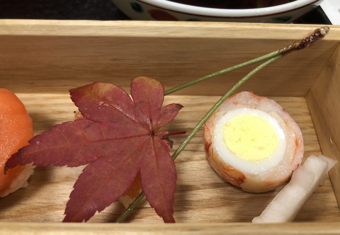 Let’s take a closer look. We have an egg wrapped with prawn. Then underneath the leaf is some Ika. The “pine needles” are actually a baked soba made to look like a pine needle.