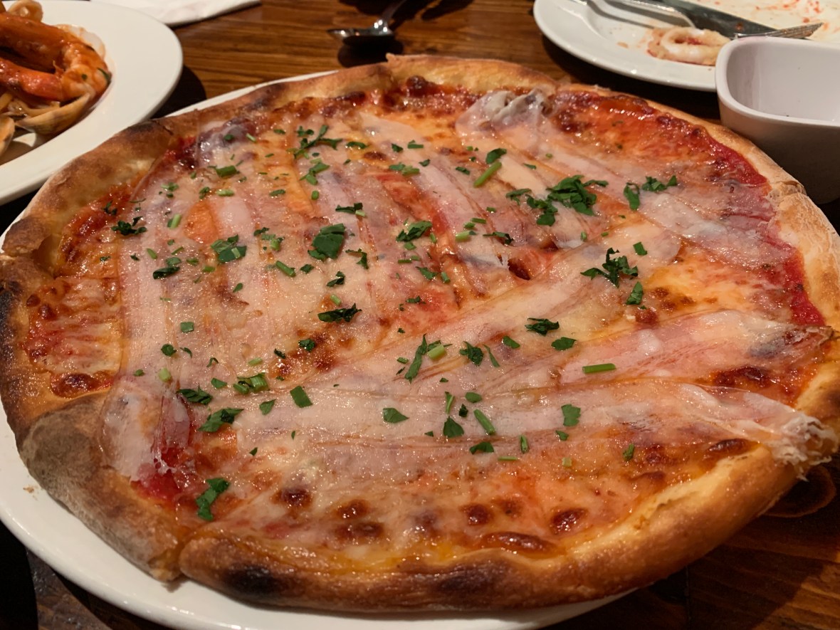 Bacon Pizza. The crust is not bad, good wood-fired pizza. Not New York style, but it’s still pretty good pizza.