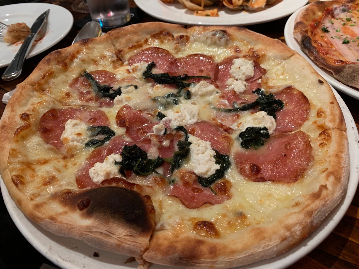 A white pizza with Salami, Ricotta and Spinach. Not bad at all.