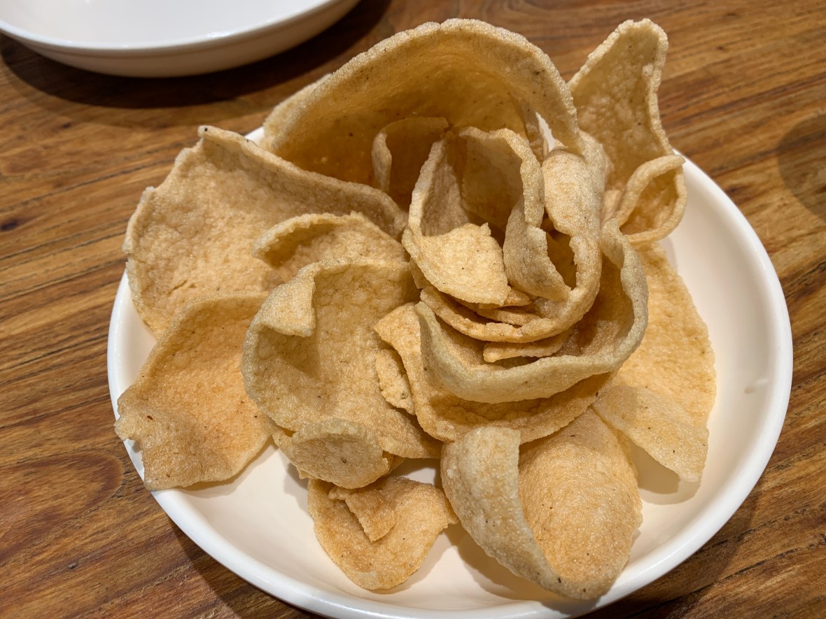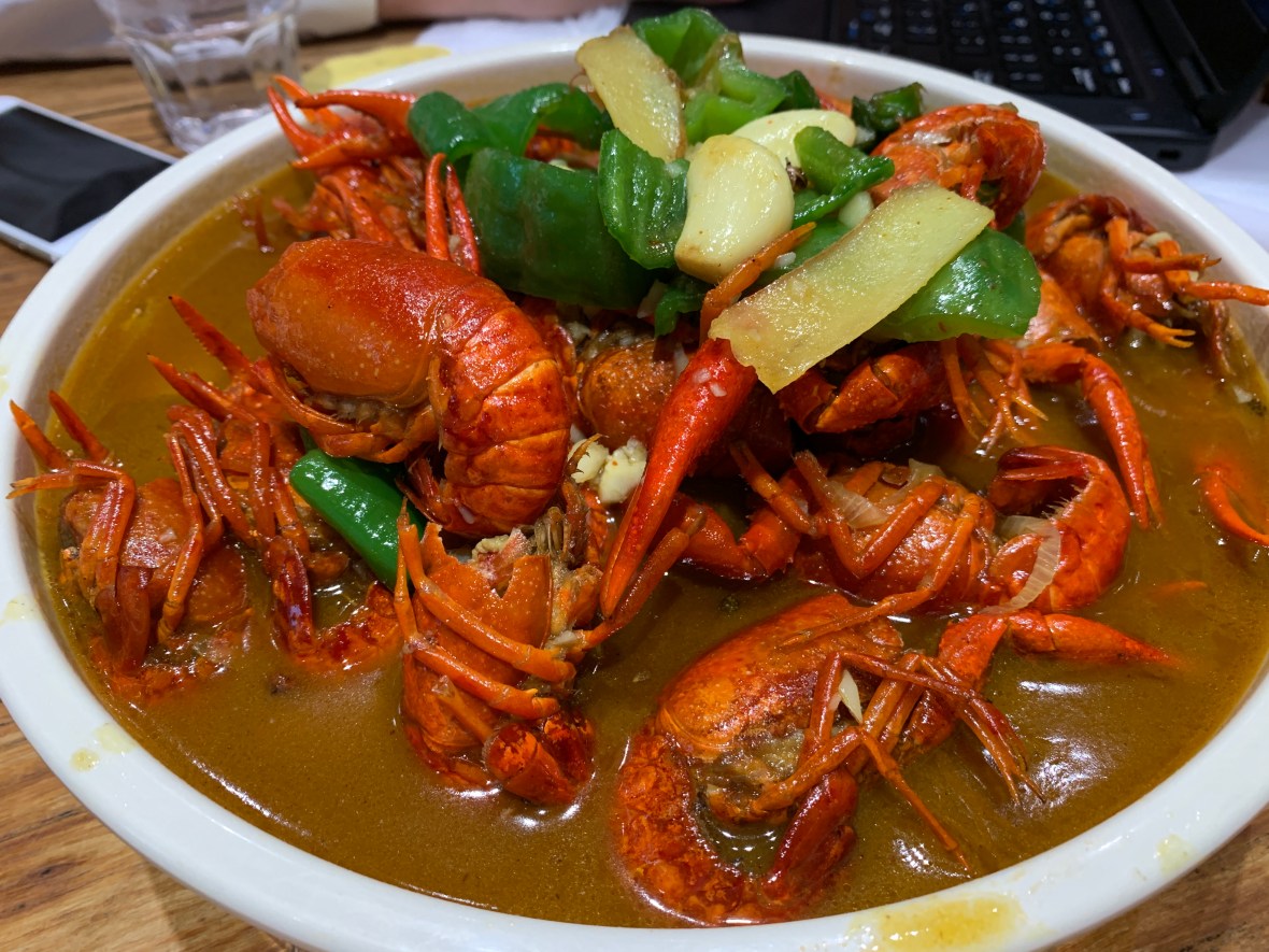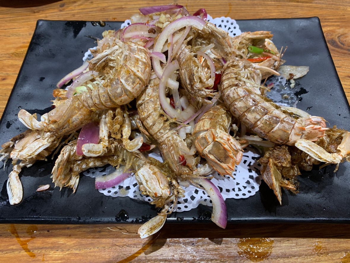 There are many ways to eat it. Interestingly enough you start with Prawn Crackers. This one is 13 Spices.  It’s spicy and good. This one is non-spicy.  Garlic and Ginger.  Quite nice also. You can add noodles to the broth afterwards. We saw the Mantis Prawn, so we tried it.  But, overcooked and not so nice.Go sit and enjoy the crayfish!