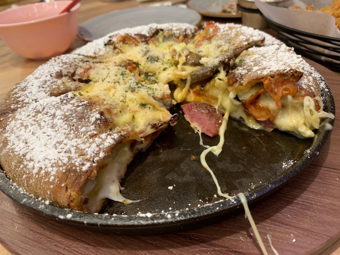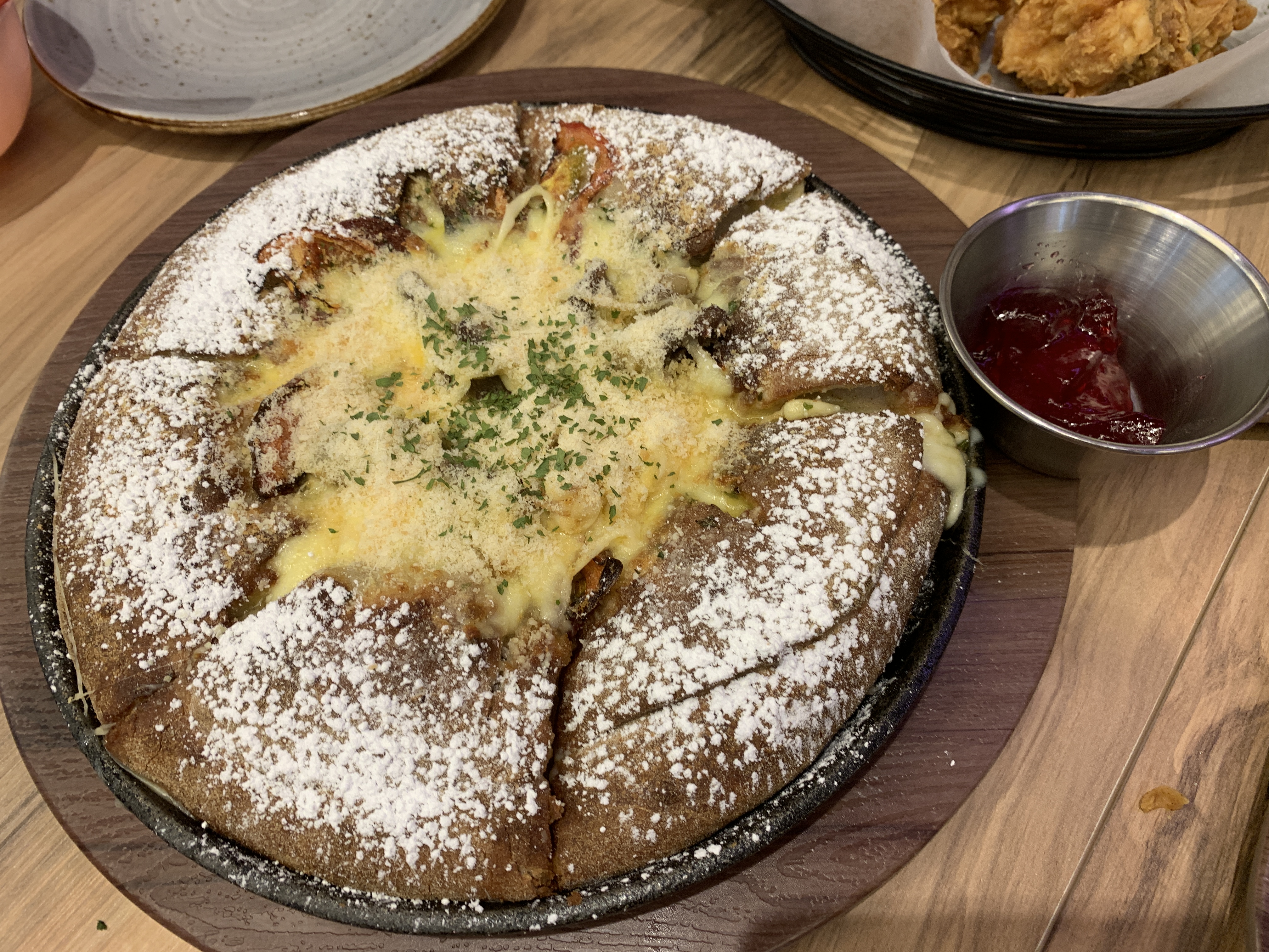 Histeak Chicago – Black Rice Dough, with plenty of cheese, beefsteak, pepperoni and bulgogi topped off with Powdered Sugar. Not exactly sure what to say about this pizza except it’s definitely not Chicago style and not sure that it’s pizza. And a side of strawberry jam to go with the pizza. Shaking my head on that one.