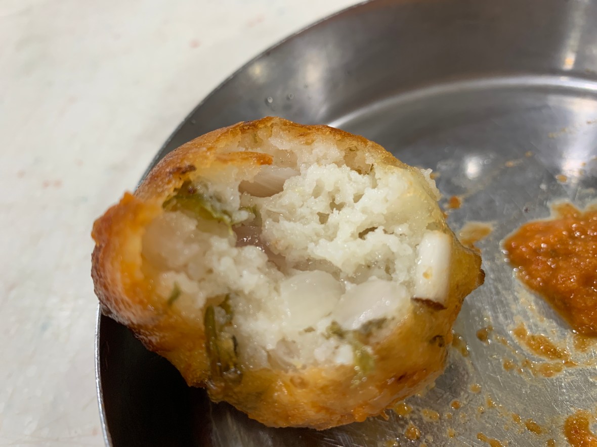 Karappam – mushy rice, onions, corn and herbs deep fried with Chutney. They cook them right in the oil outside.