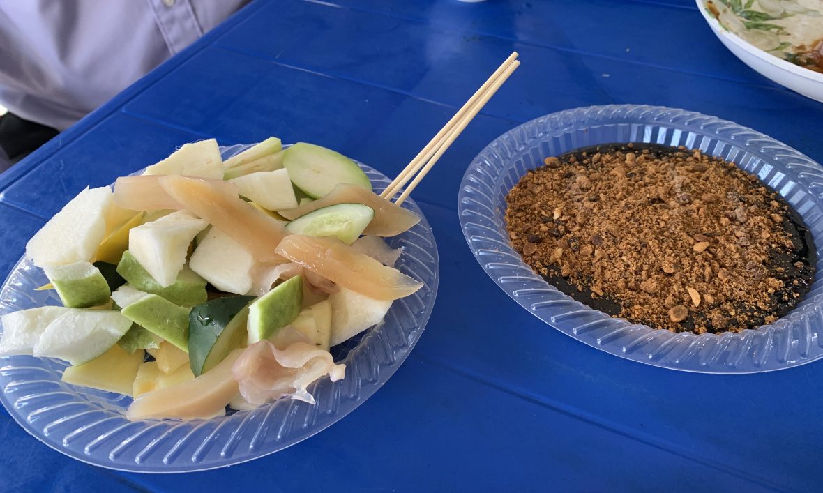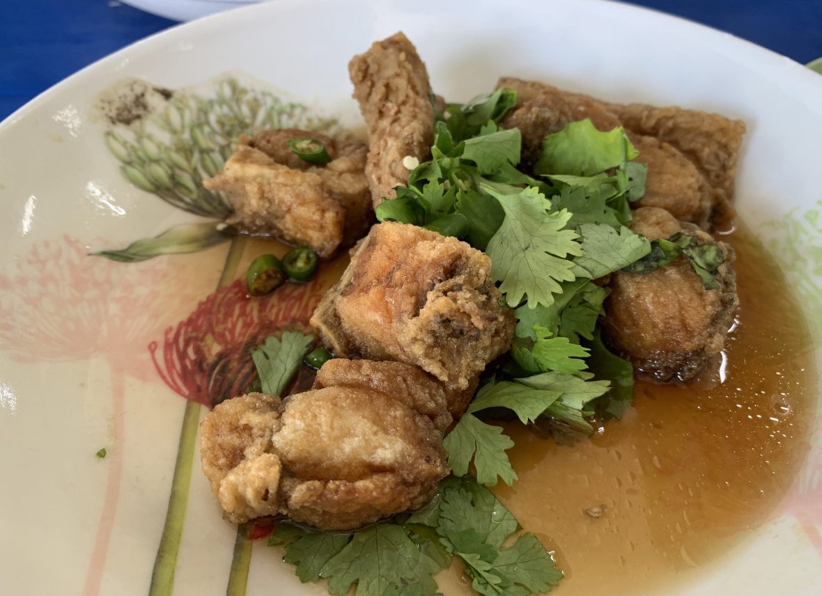 Here is the Rojak.  Dip your own.  It is quite nice and refreshing to dip your own.  My biggest problem sometimes is that there is too much sauce, or not enough.  Here, it’s up to you. We started of with a little bit of egg. Fried Fish