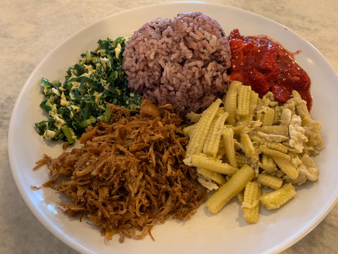 Here we have Baby Corn, Mani Cai with egg, Shredded Pork and Red Bean Paste Pork with Mountain Bario Rice. Jungle or not, it tastes good!
