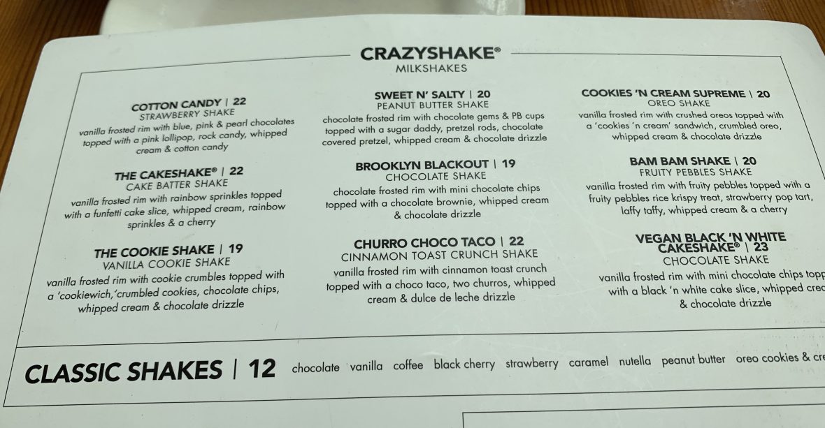 Known for Burgers and Crazy Milkshakes, the menu shows it.