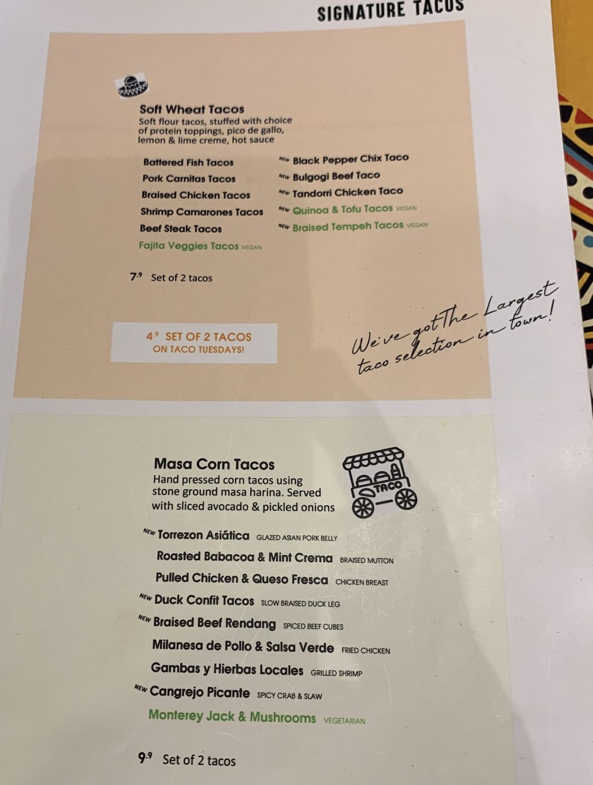 I wish that the toppings and sauces varied depending on the filling. It was the same for all Soft Tortillas and Corn Tortillas. More variety would have brought out the tacos even more.