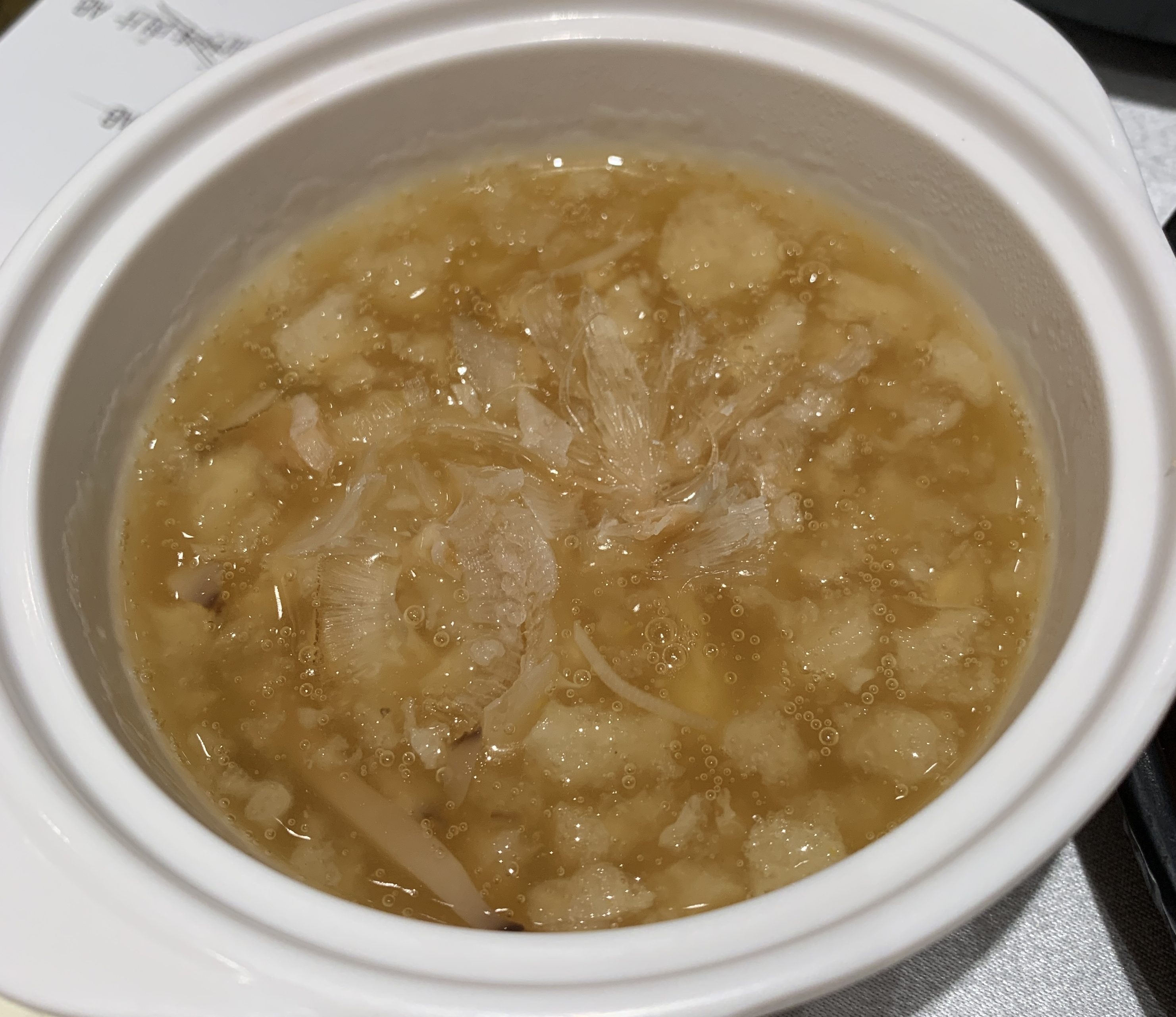 Braised Shark Fin with Fish Maw, Braised E-Fu Noodles, Stir Fried Beef, Century Egg and Lean Pork Congee – sampling of dishes – all good.