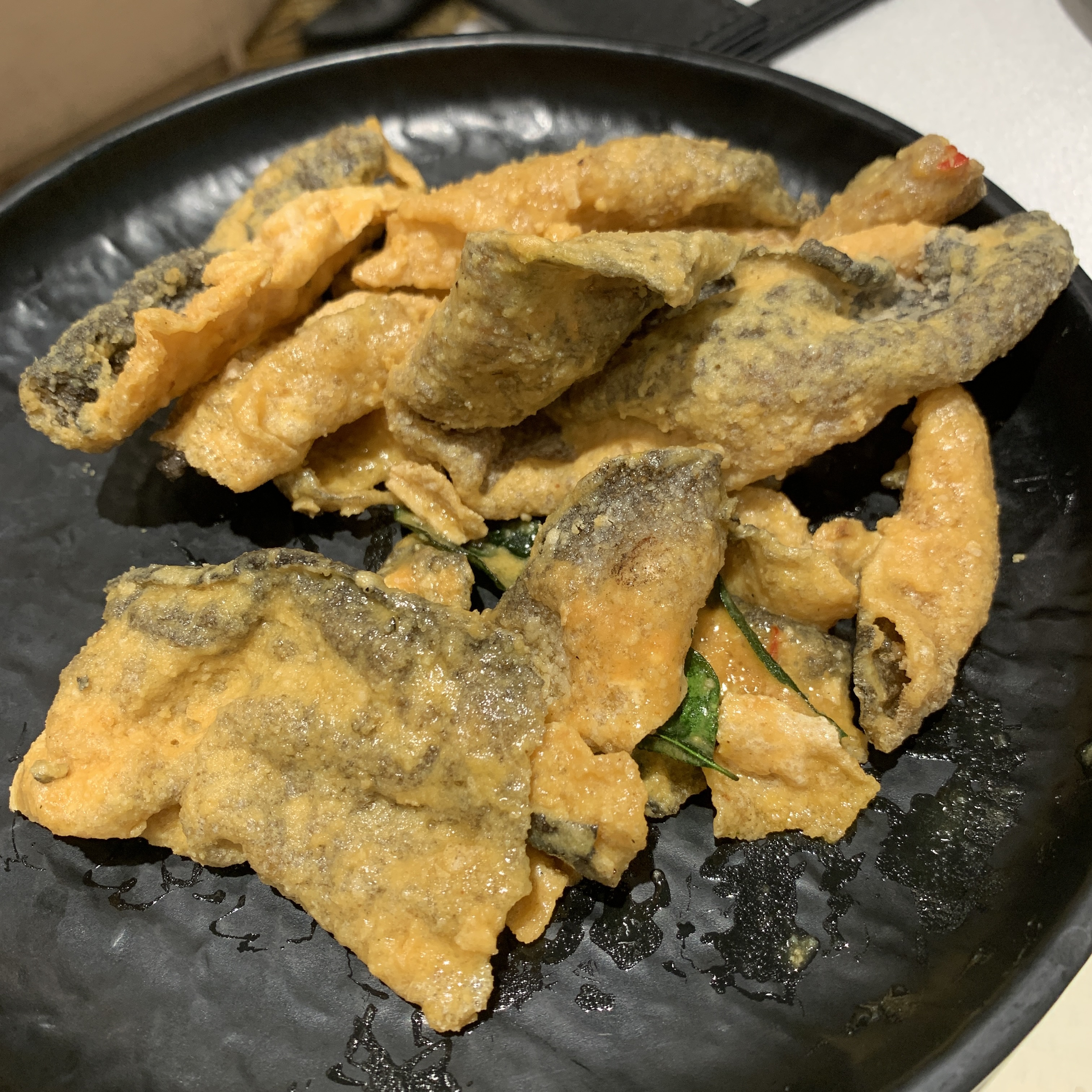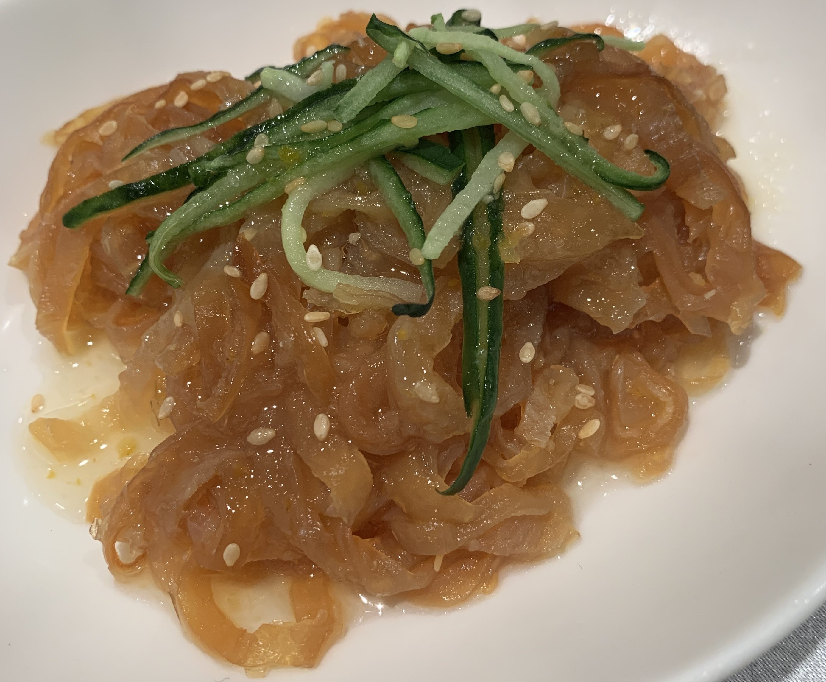 Cuttlefish You Tiao in Rojak Sauce, Har Cheong Gai, Salted Egg Salmon Skin, Jellyfish and Salmon Sashimi – all good!