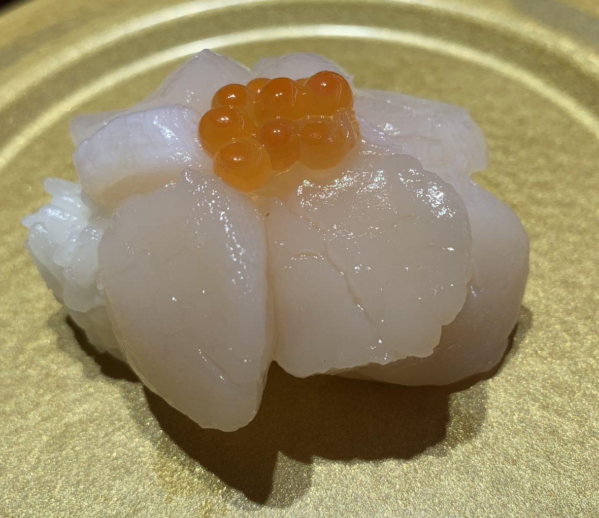 Salmon Belly, Ebi Gunkan, Hotate with Ikura, Sesame Miso Tai, Kani, Whole Ika with Ponzu Jelly, Amaebi, Ikura Gunkan and Prawn Avocado Roll.