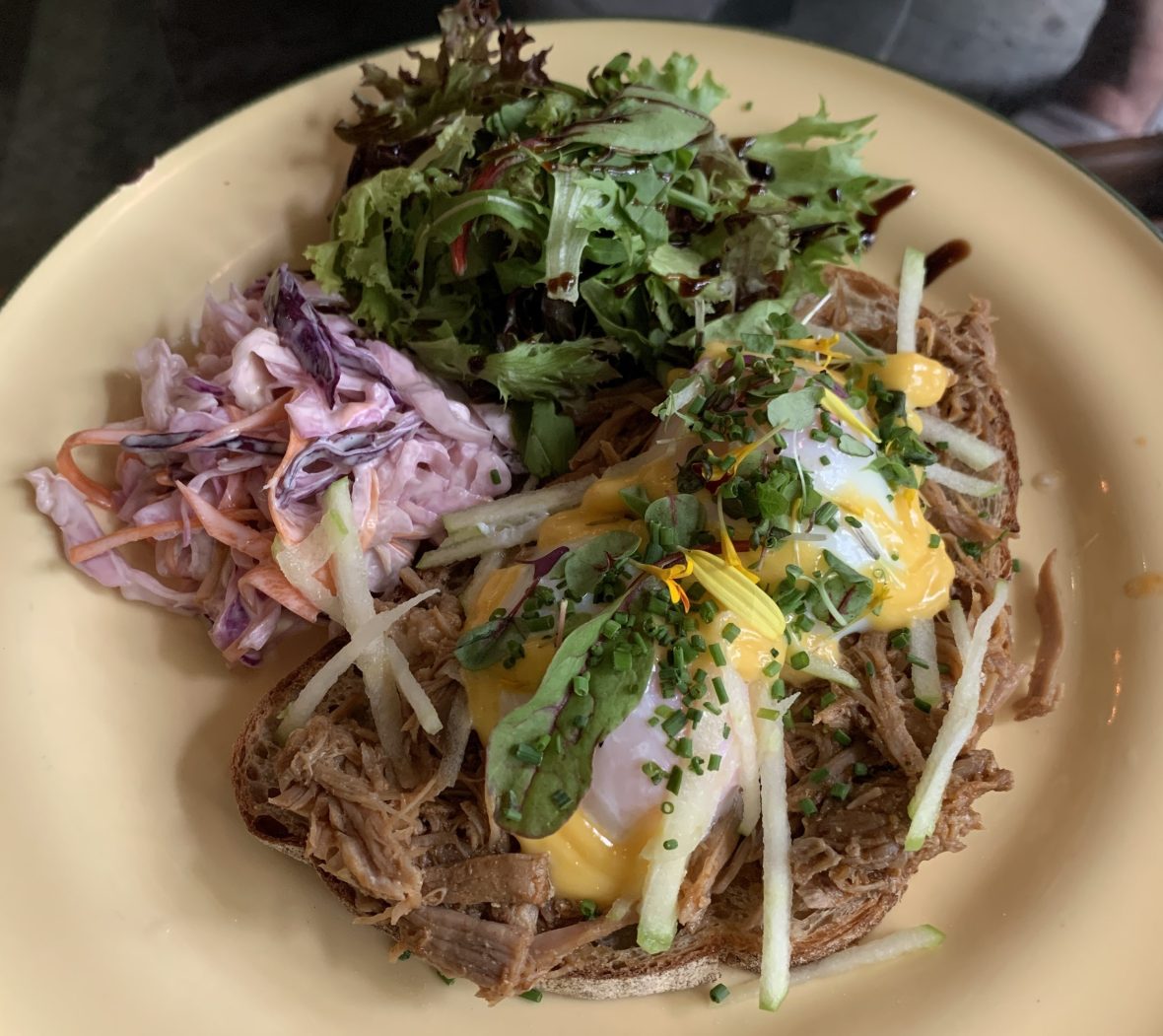 But Brunch means Benedict for me. In this case their Pulled Pork Benedict. Very flavorful and certainly right up my taste alley. Lots of salad to clean up the palate.