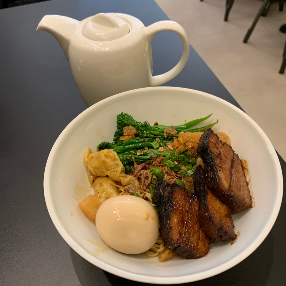 I tried the Signature Wanton Noodles. Here the Char Siew is replaced by Pork Belly, the Chai Xin by Broccolini and an Onsen Egg is added, along with their Wanton. The soup was placed in a small teapot.