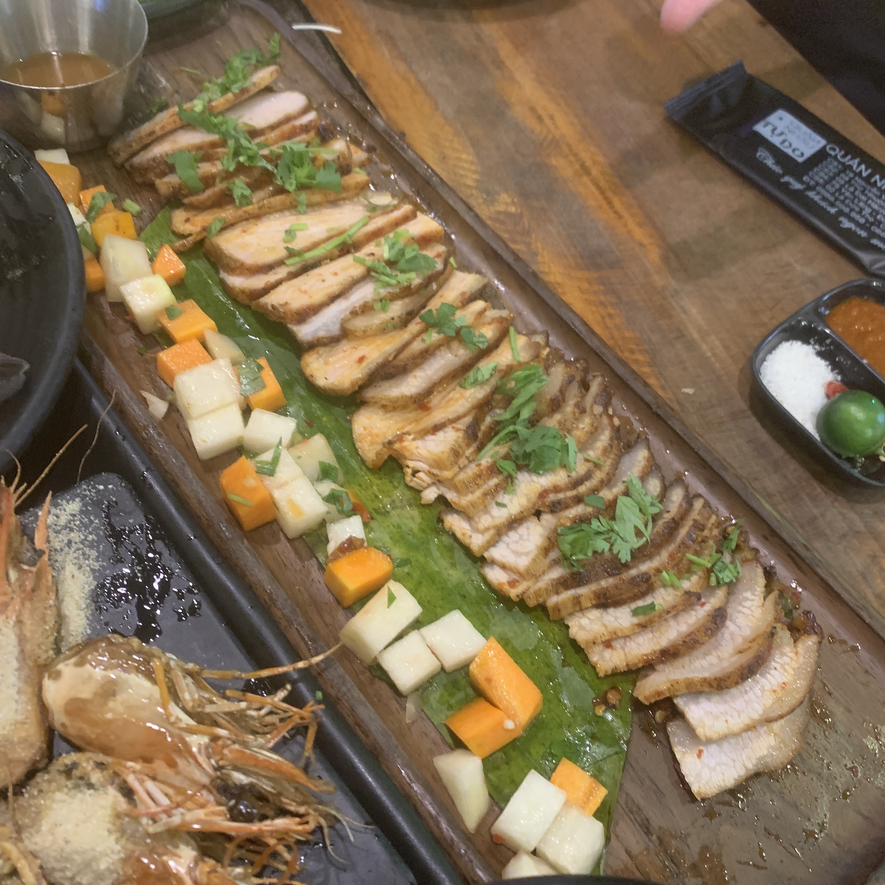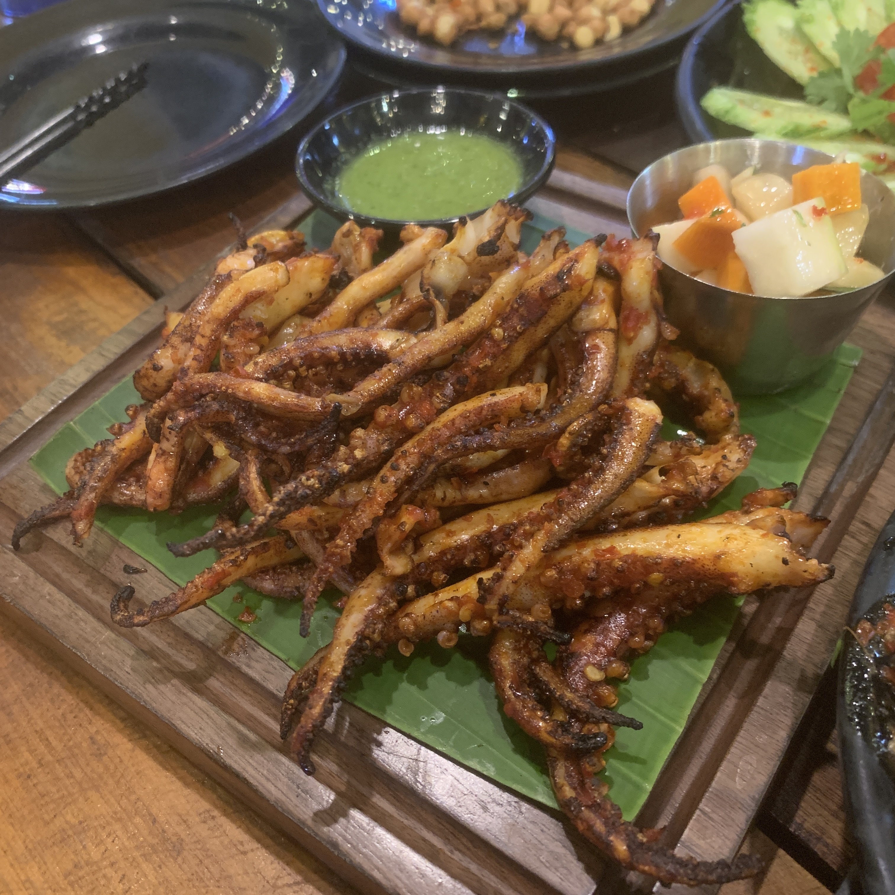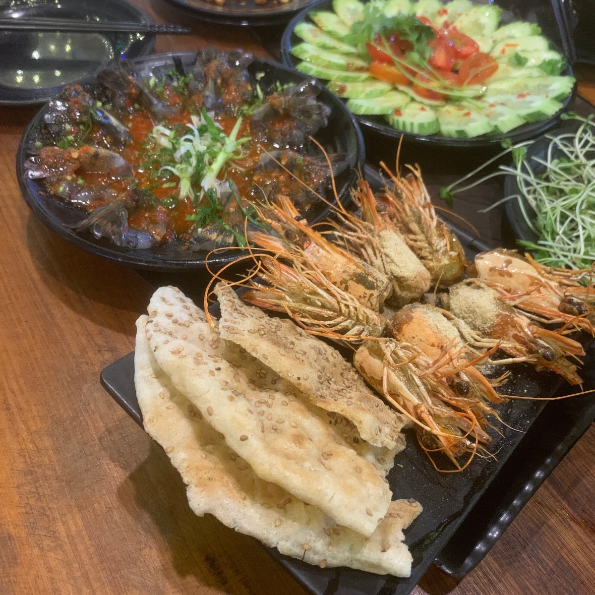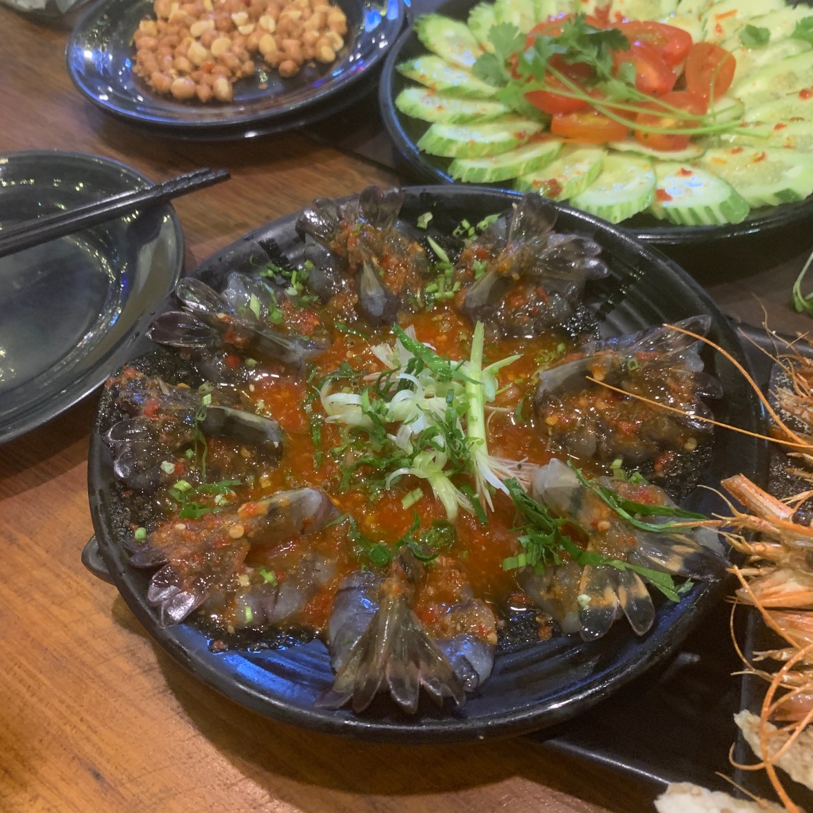Raw Prawn Salad with chili and lime sauce, the heads fried with some crackers. Ok for me.