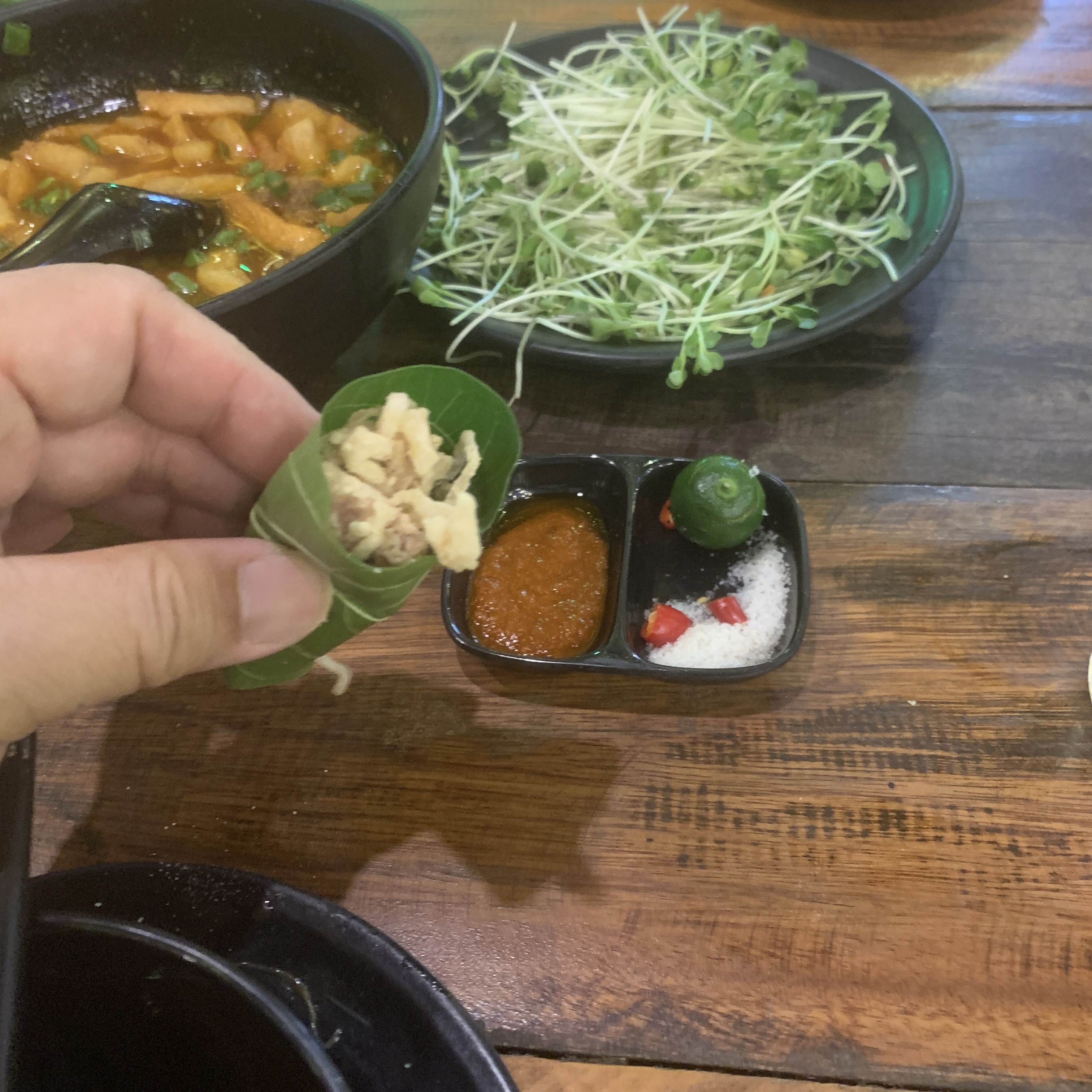 Some Fried Pork Rinds in sauce with Sprouts to balance it out. Nothing can balance out the oil and fat from the Rinds. It was way too oily.