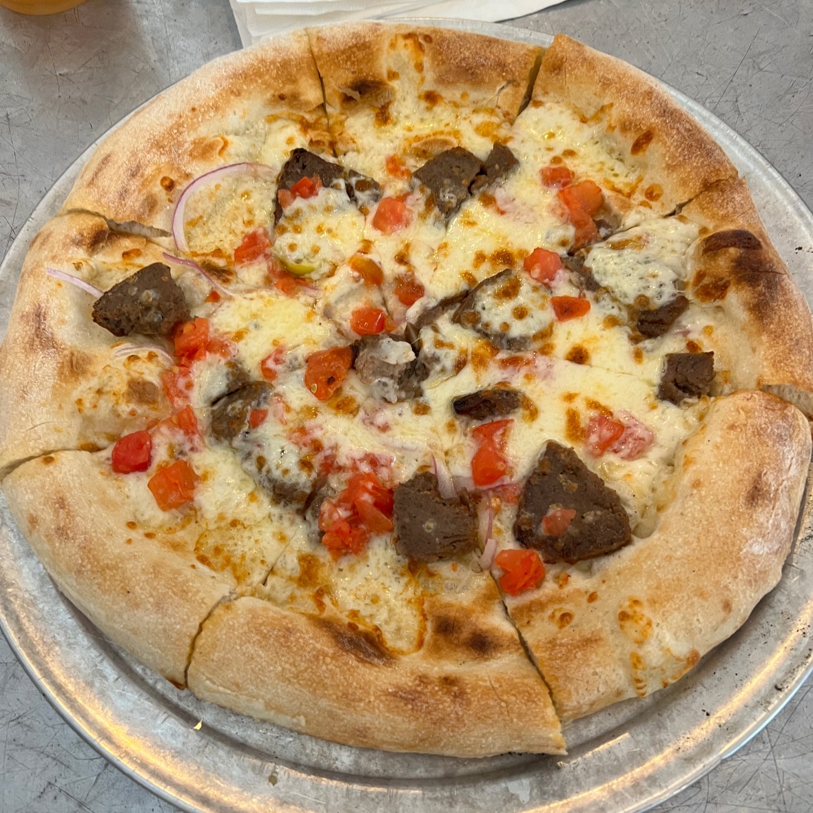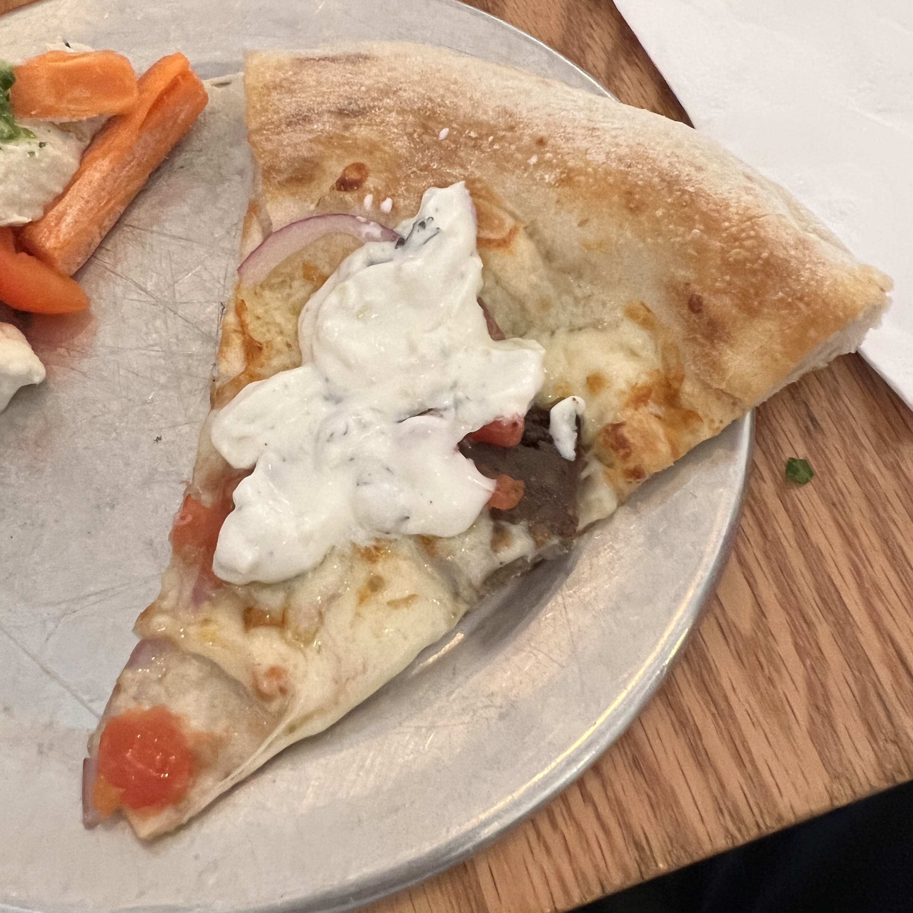 An interesting choice is the Gyro Pizza. Made with Gyro meat (Beef/Lamb), it comes with a side of Tzatziki sauce, you put it on the pizza and eat. Not exactly like a real Gyro, but it’s taste is quite close.
