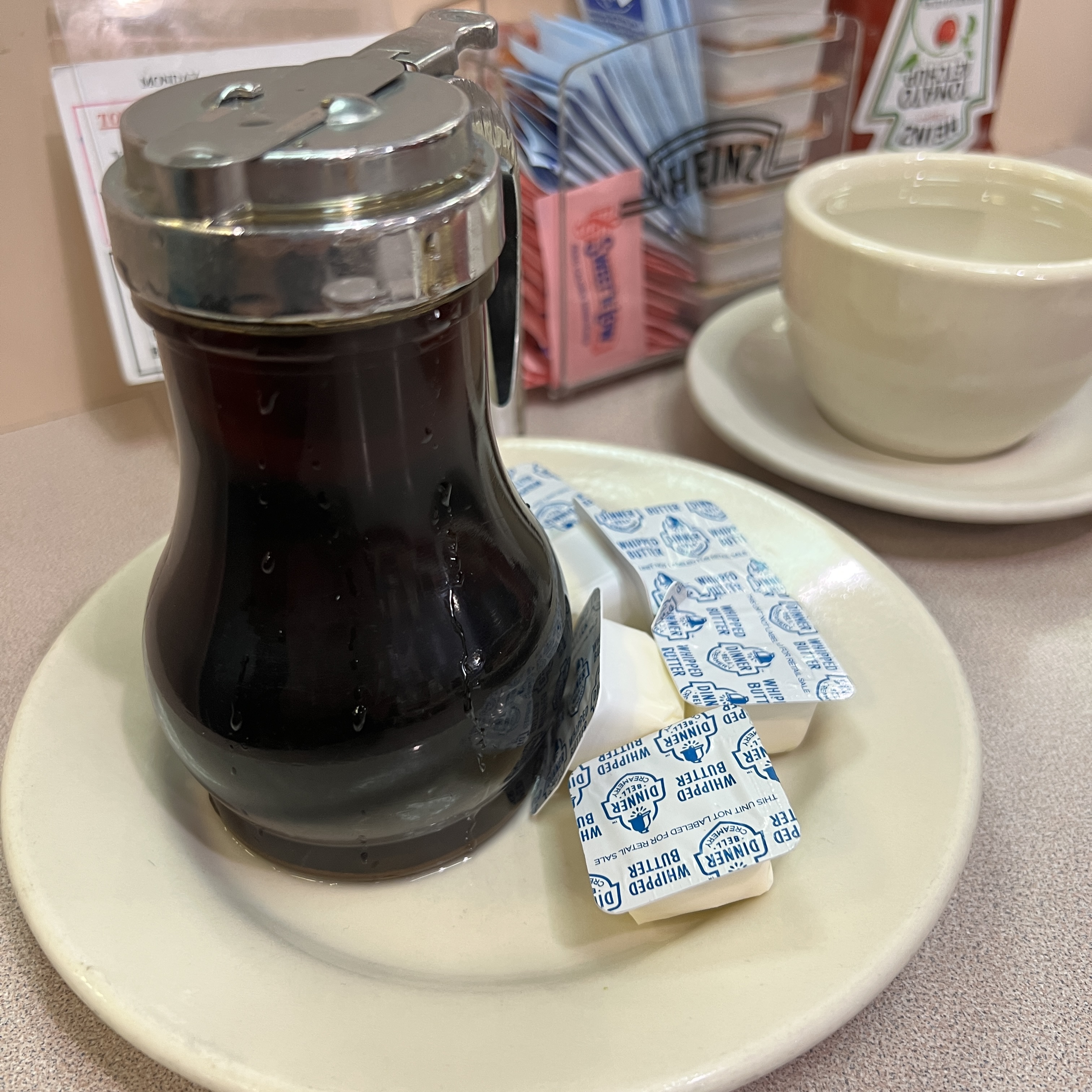 Pancakes with Bacon and Sausage and Challah French Toast with Sausage.