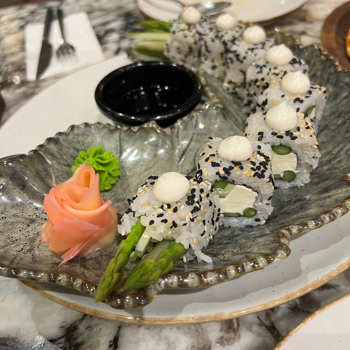 A Cream Cheese, Avocado and Asparagus Roll. Too much cream cheese for me, I had to take most of it out to enjoy it.