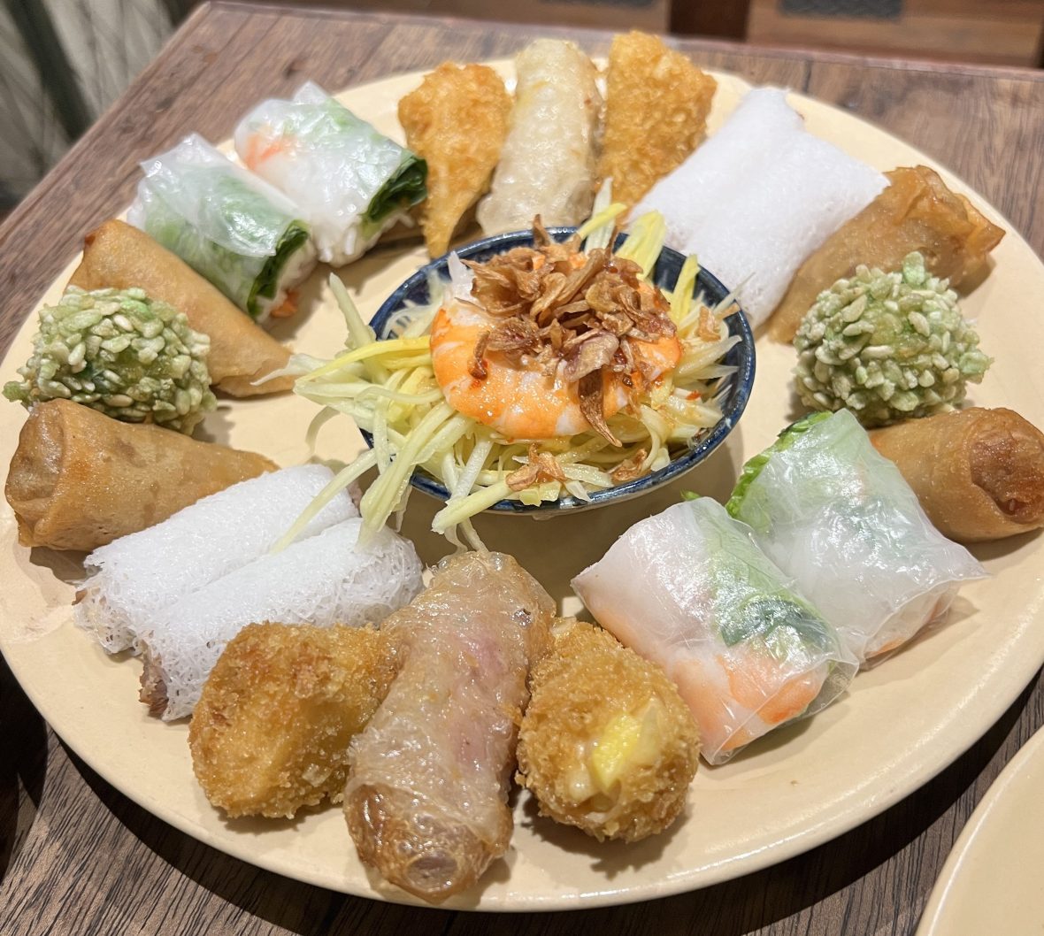 A sampling of the Rolls served Cha Gio Quan Bui (with Crab and Prawn), Seafood Spring Rolls, Cha Gio Tom Ga (Prawn and Chicken), Rolls with Fish Paste and Quail Eggs, Fried Spring Rolls with Pork and Prawn, and Bredfruit wrapped with Prawn and Minced Pork.