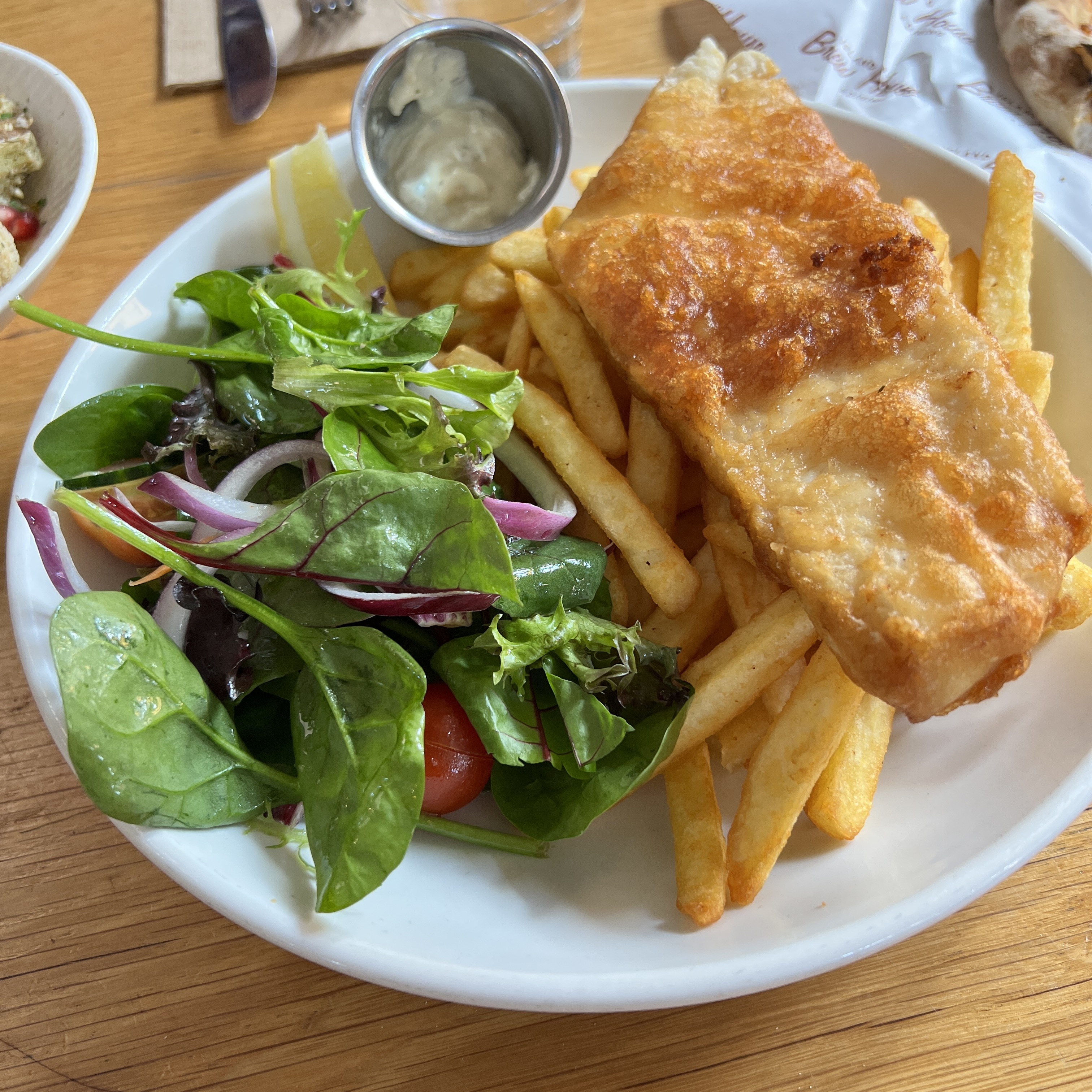 Fish and Chips is the first meal, and the batter was nice and crisp, fish was fresh and the chips crispy and hot. A great rendition.