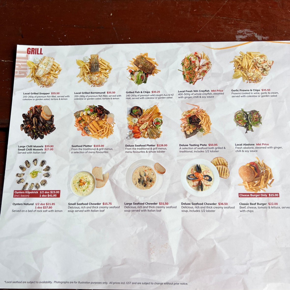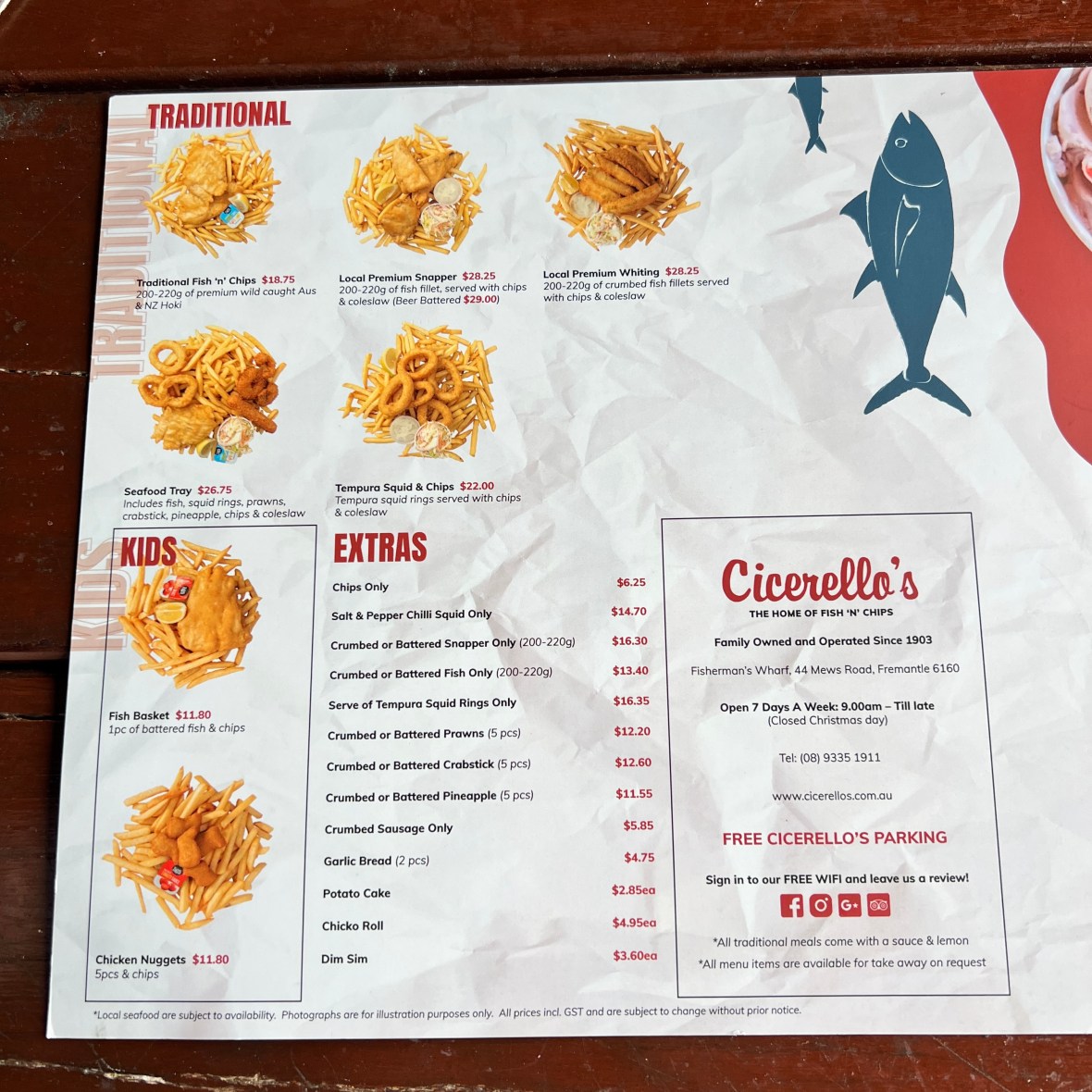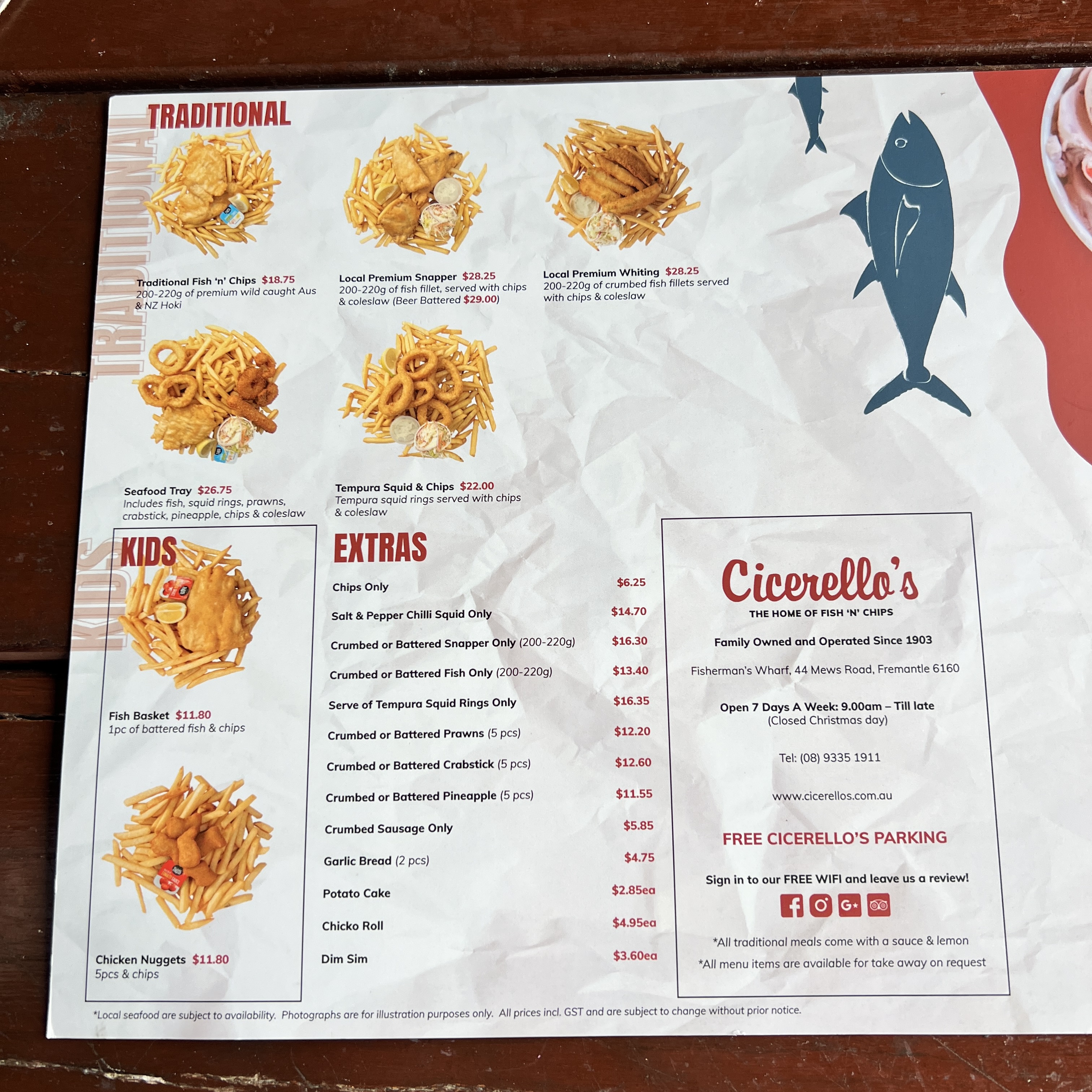 Cicerello’s is one of the many establishments in Fremantle right on the Fishing Harbour. With the number of them located there it is so difficult to choose. We went for Cicarello’s because of a local’s recommendation and also because it had Grilled Fish options.