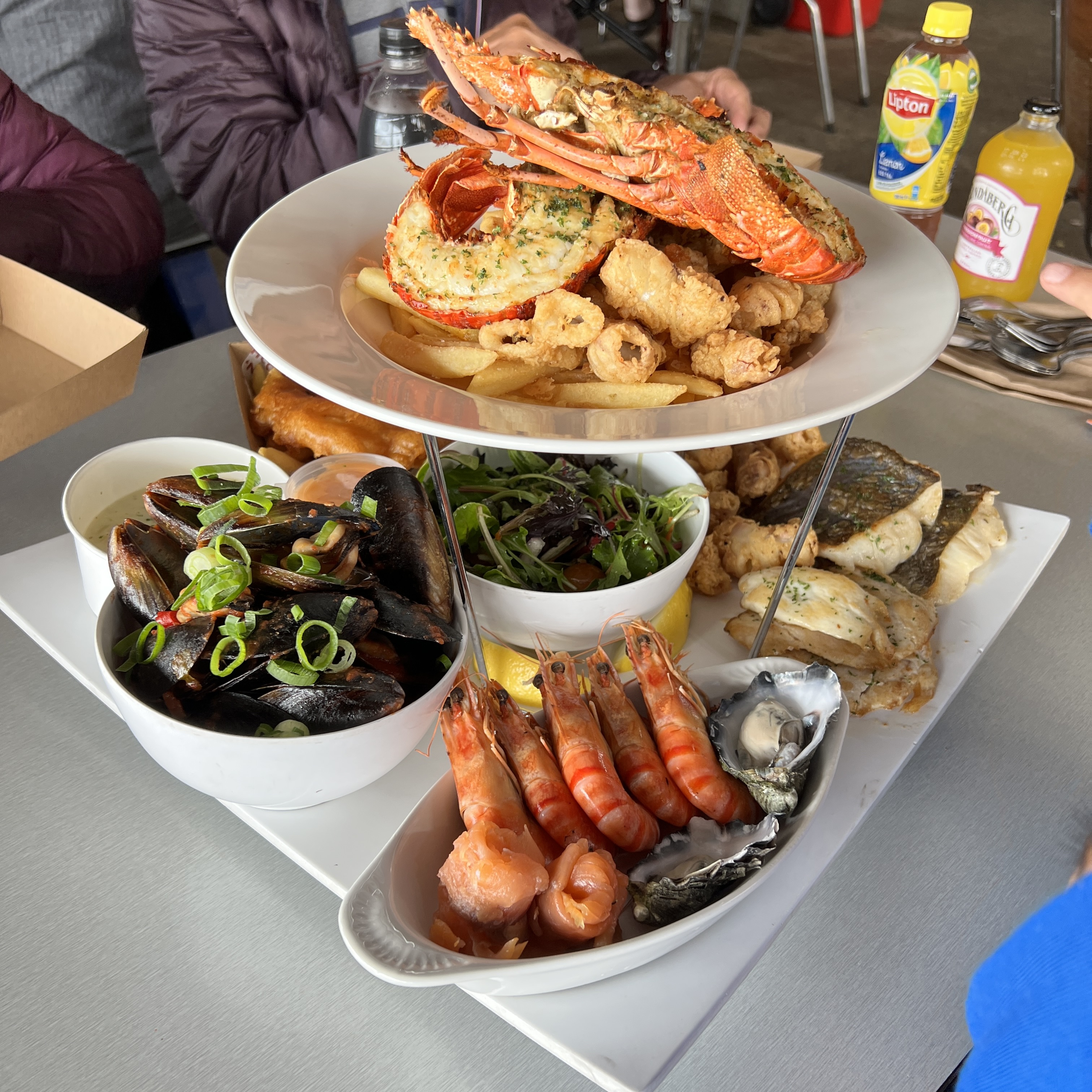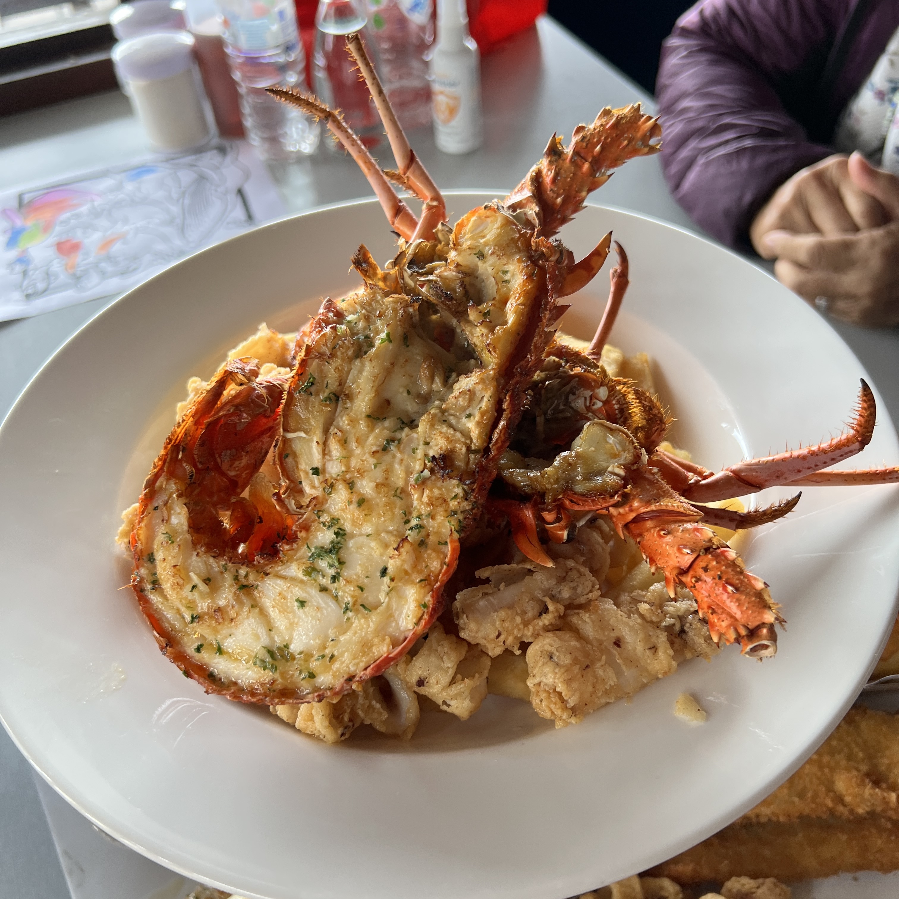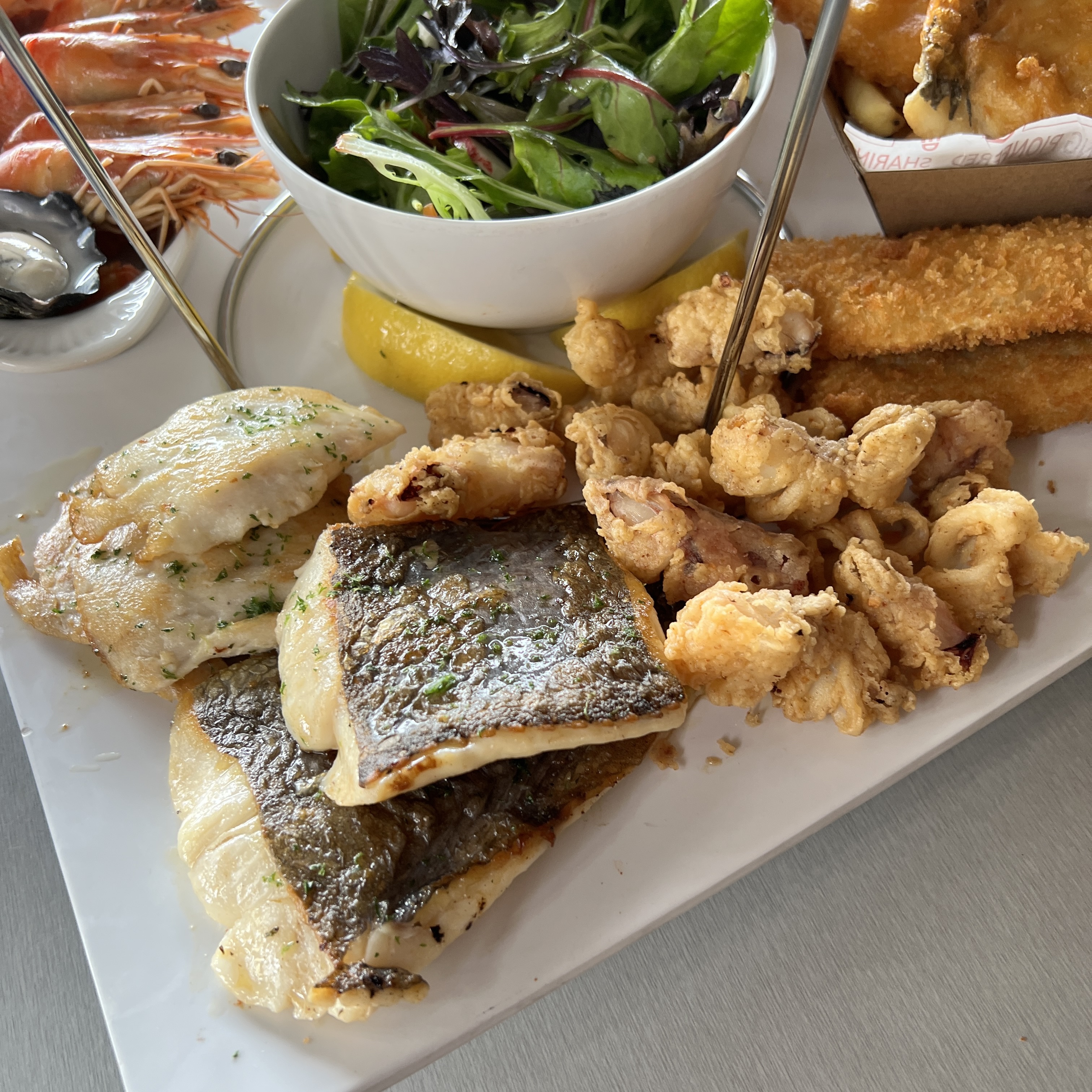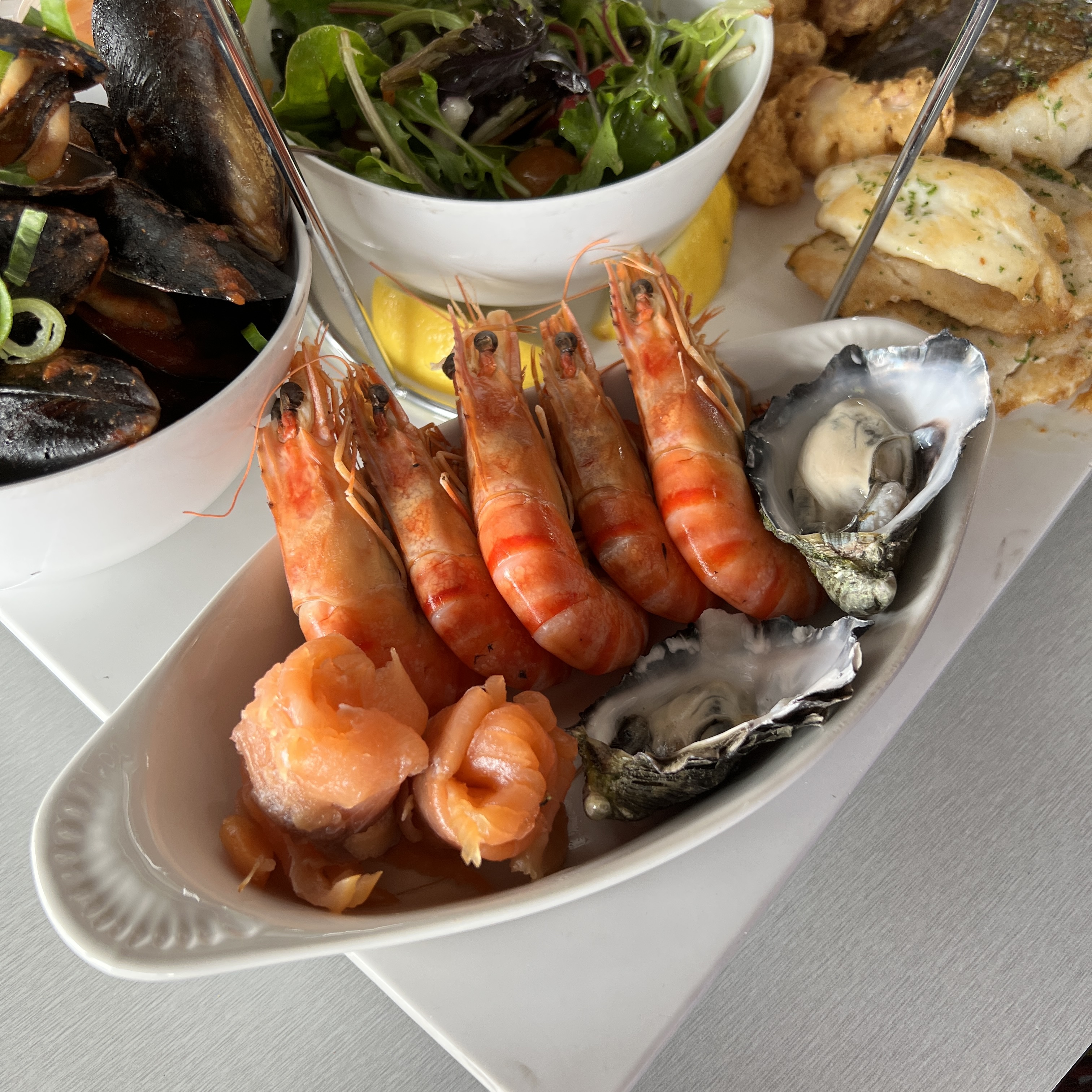 A Whole Crayfish (Lobster), Fried Hake and Snapper, Grilled Hake and Snapper, Fried Calamari, Oysters, Prawns, Smoke Salmon, Chili Mussels, Seafood Chowder, Salad and a boatload of Chips.