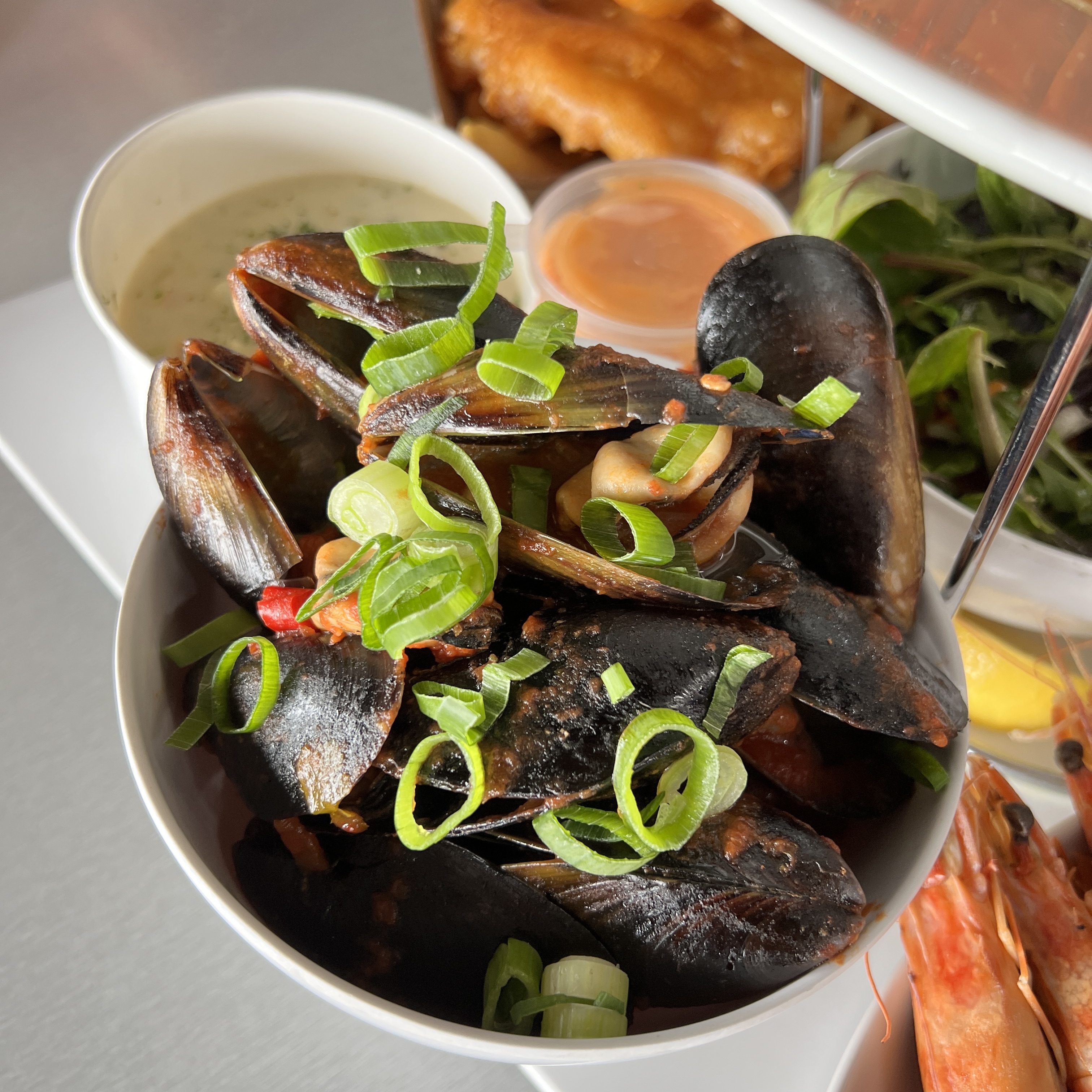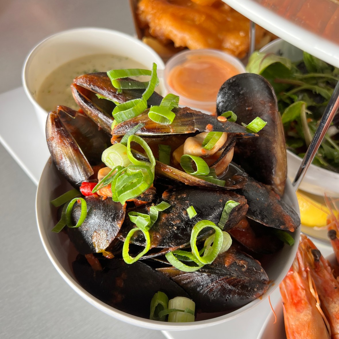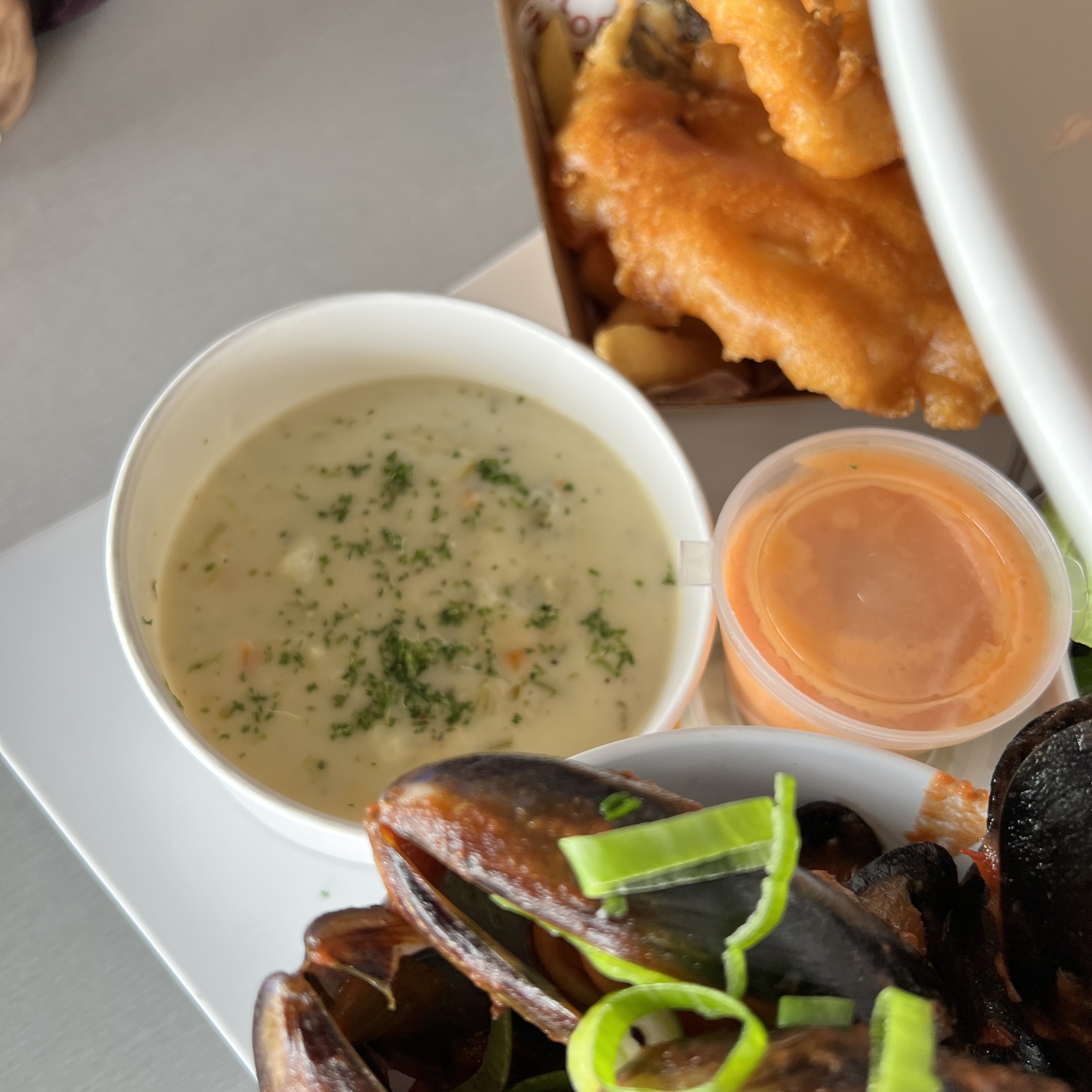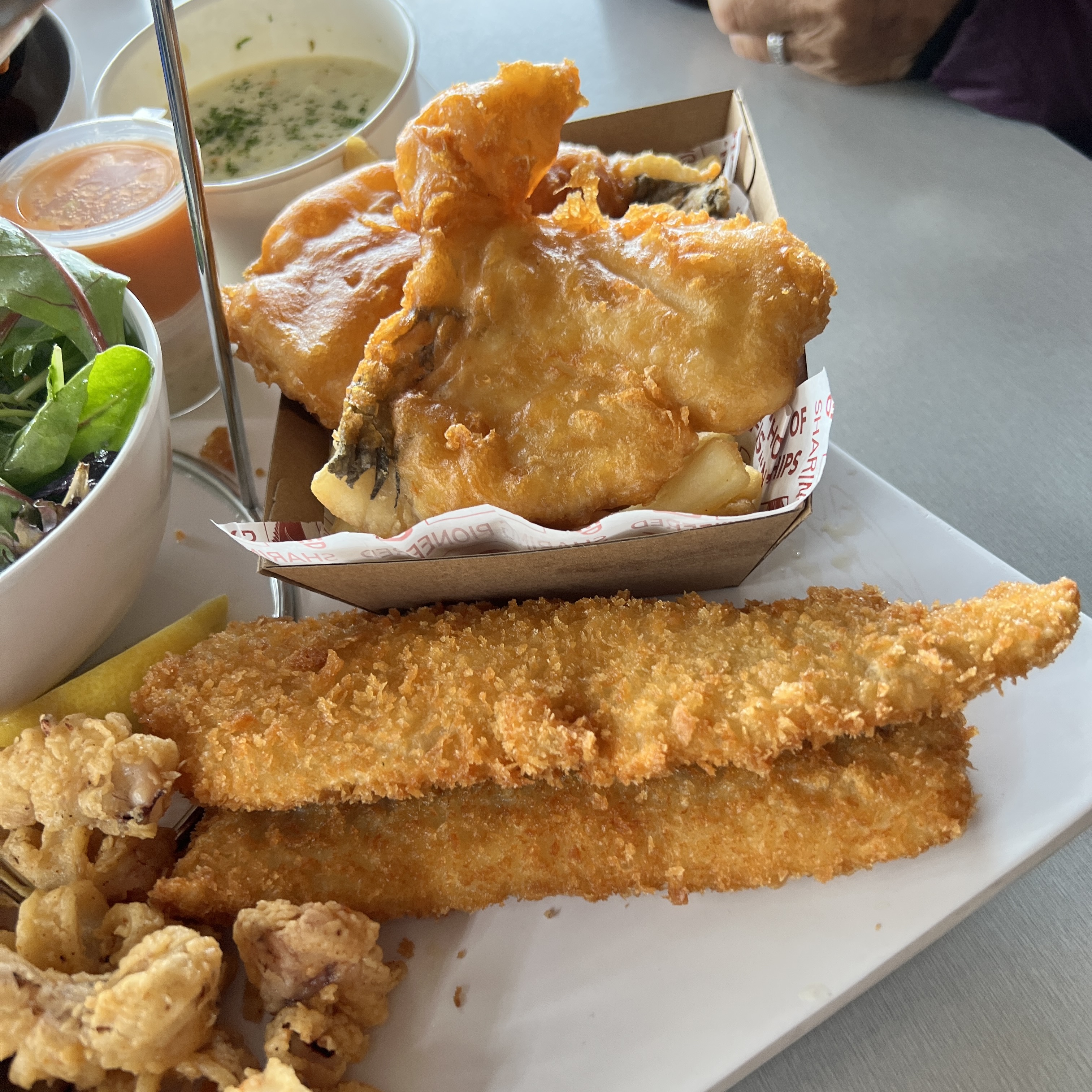 A Whole Crayfish (Lobster), Fried Hake and Snapper, Grilled Hake and Snapper, Fried Calamari, Oysters, Prawns, Smoke Salmon, Chili Mussels, Seafood Chowder, Salad and a boatload of Chips.