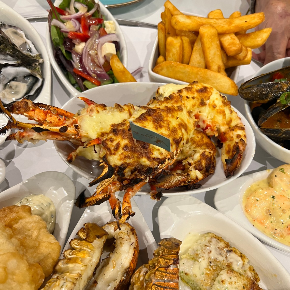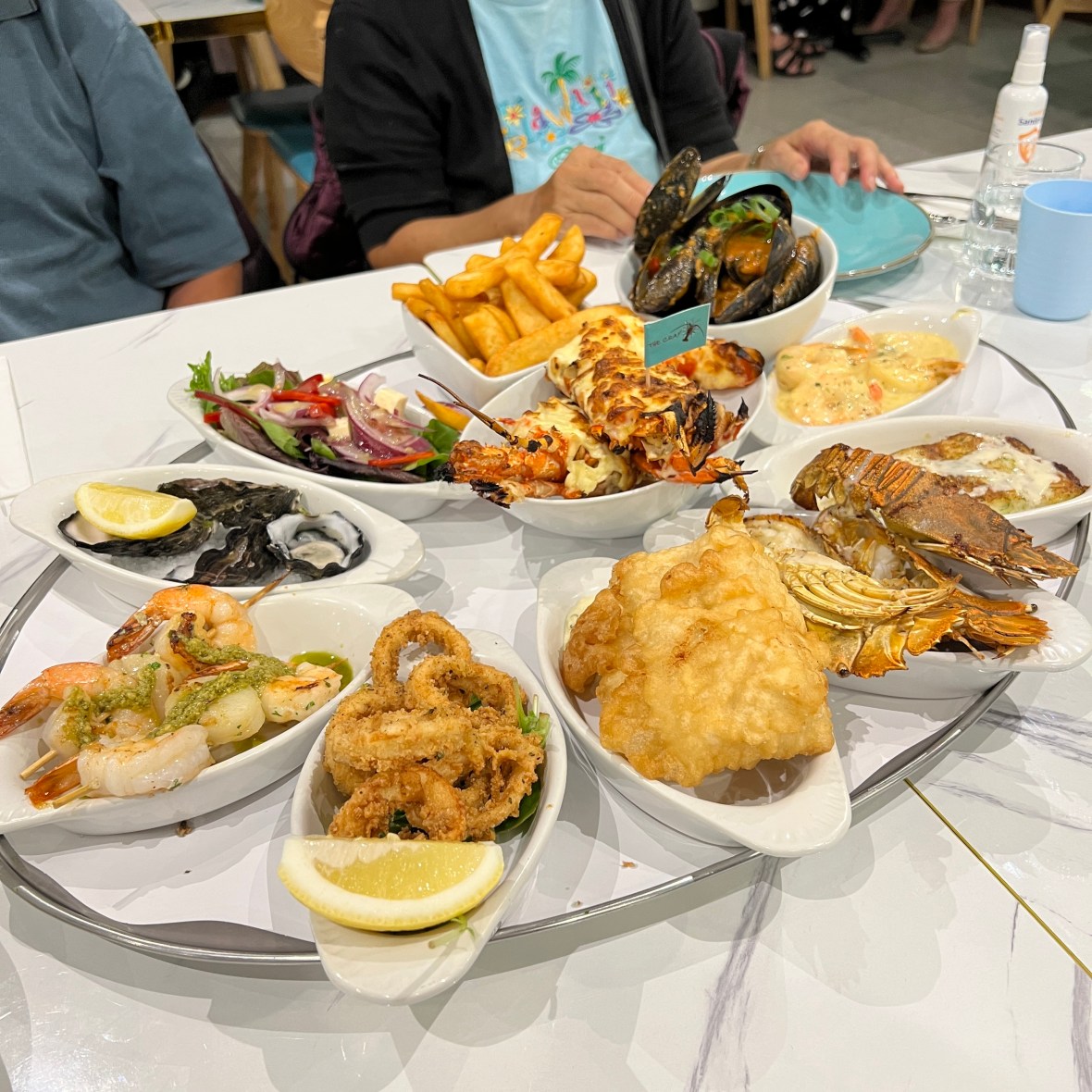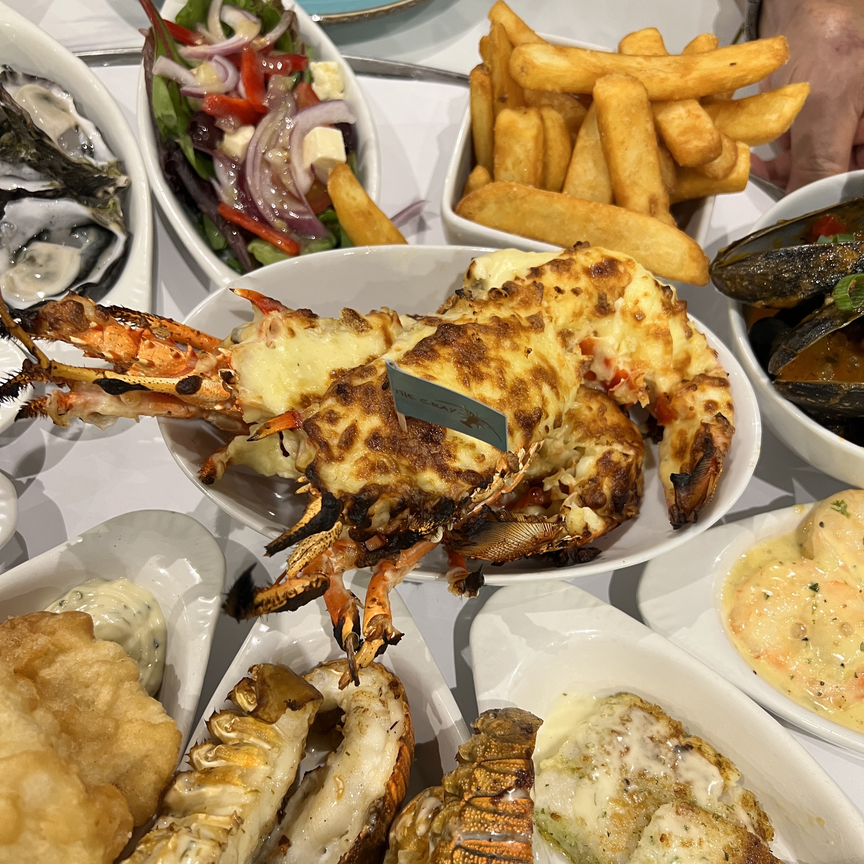 A full Mornay Crayfish, Prawn and Scallop Skewers, Oysters, Calamari Rings, Fried Barramundi, Moreton Bay Bugs, Grilled Snapper, Garlic Butter Prawns, Chili Mussels, Salad, Chips and some added Tumeric Rice.