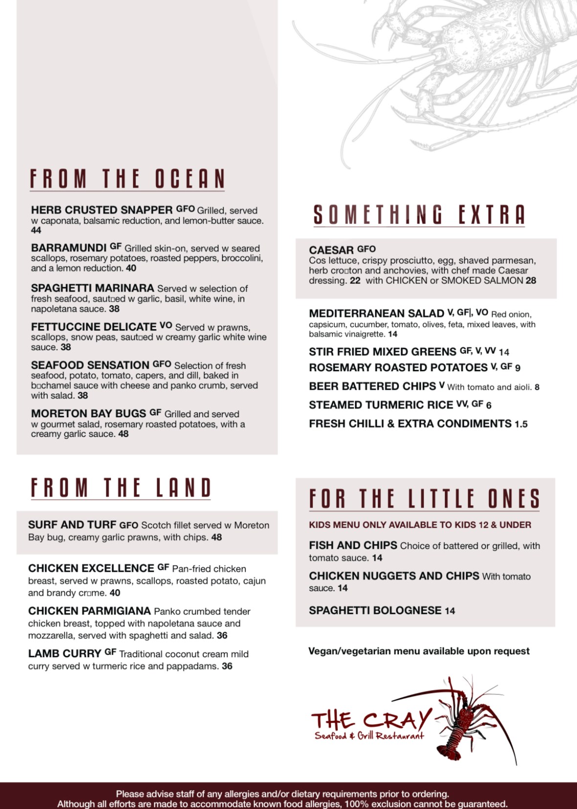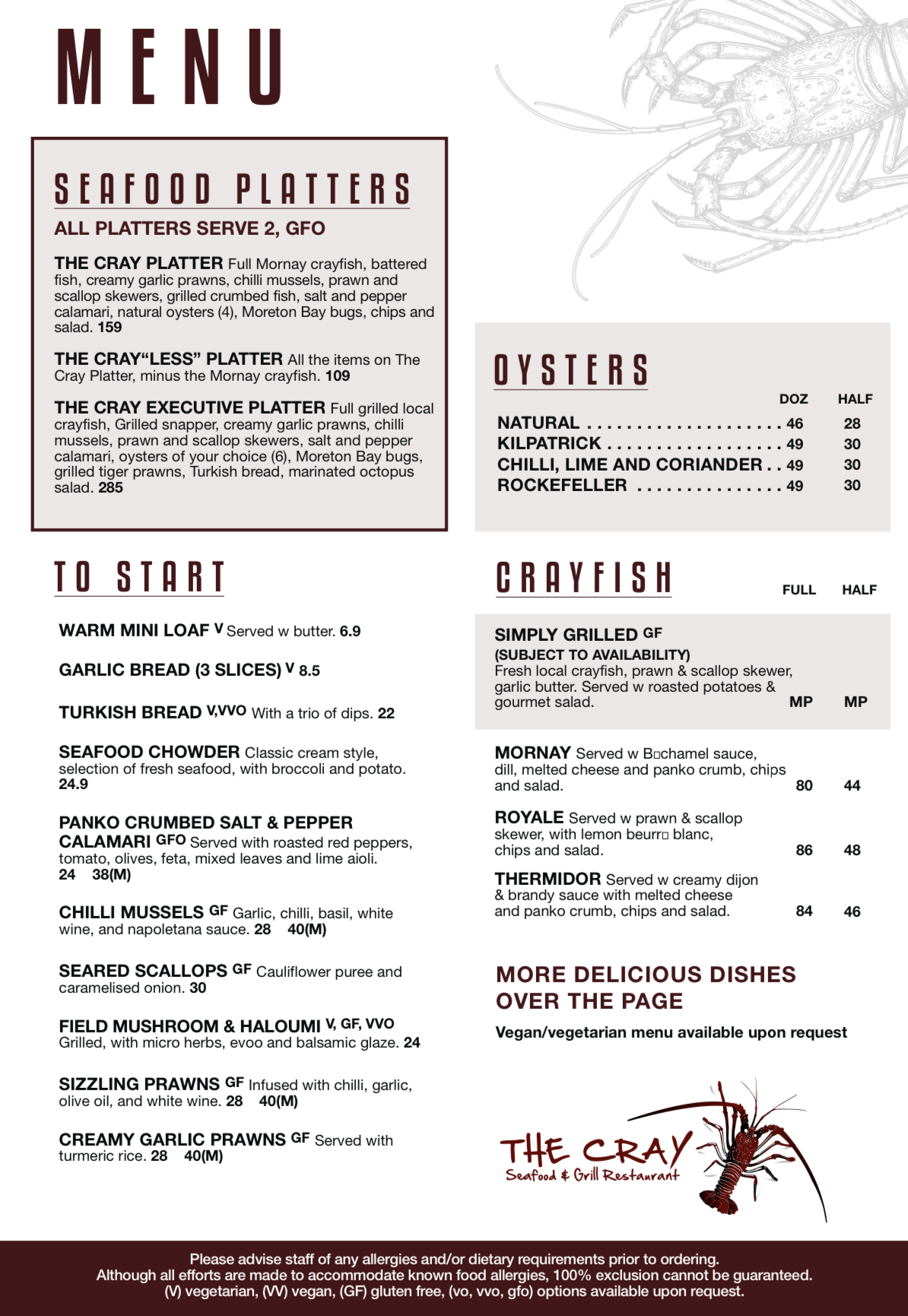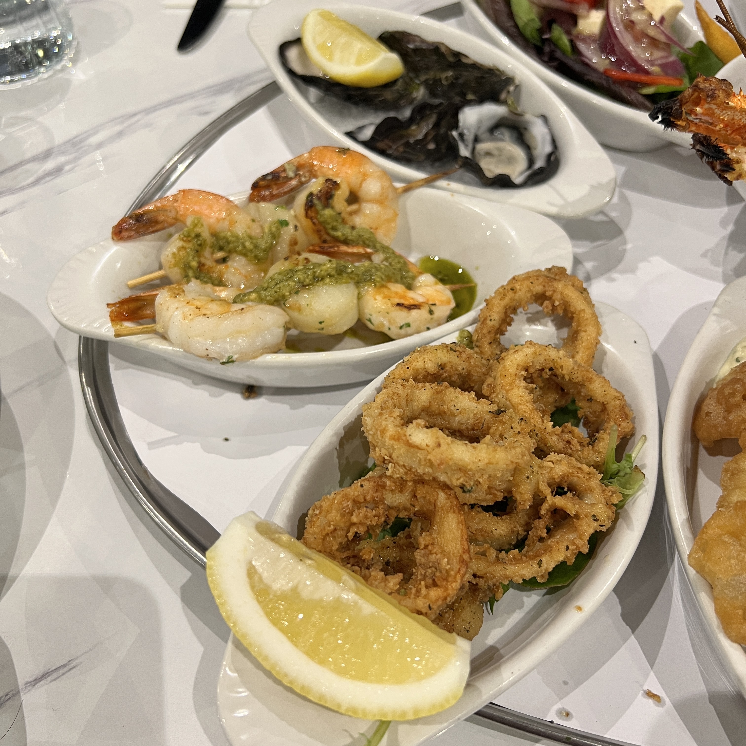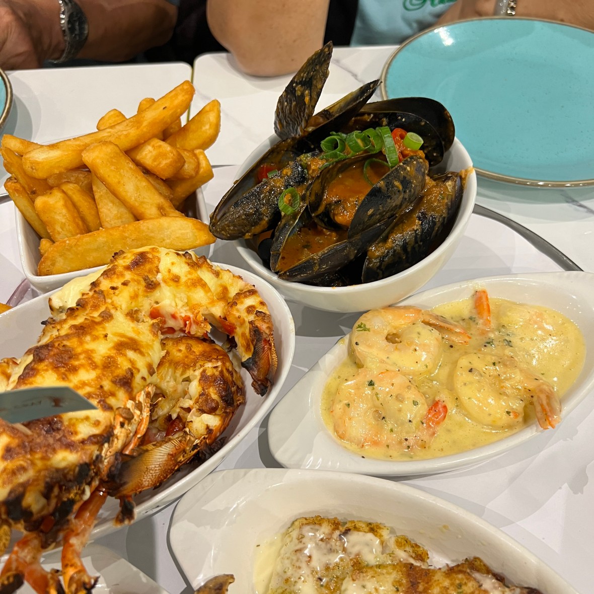 A full Mornay Crayfish, Prawn and Scallop Skewers, Oysters, Calamari Rings, Fried Barramundi, Moreton Bay Bugs, Grilled Snapper, Garlic Butter Prawns, Chili Mussels, Salad, Chips and some added Tumeric Rice.