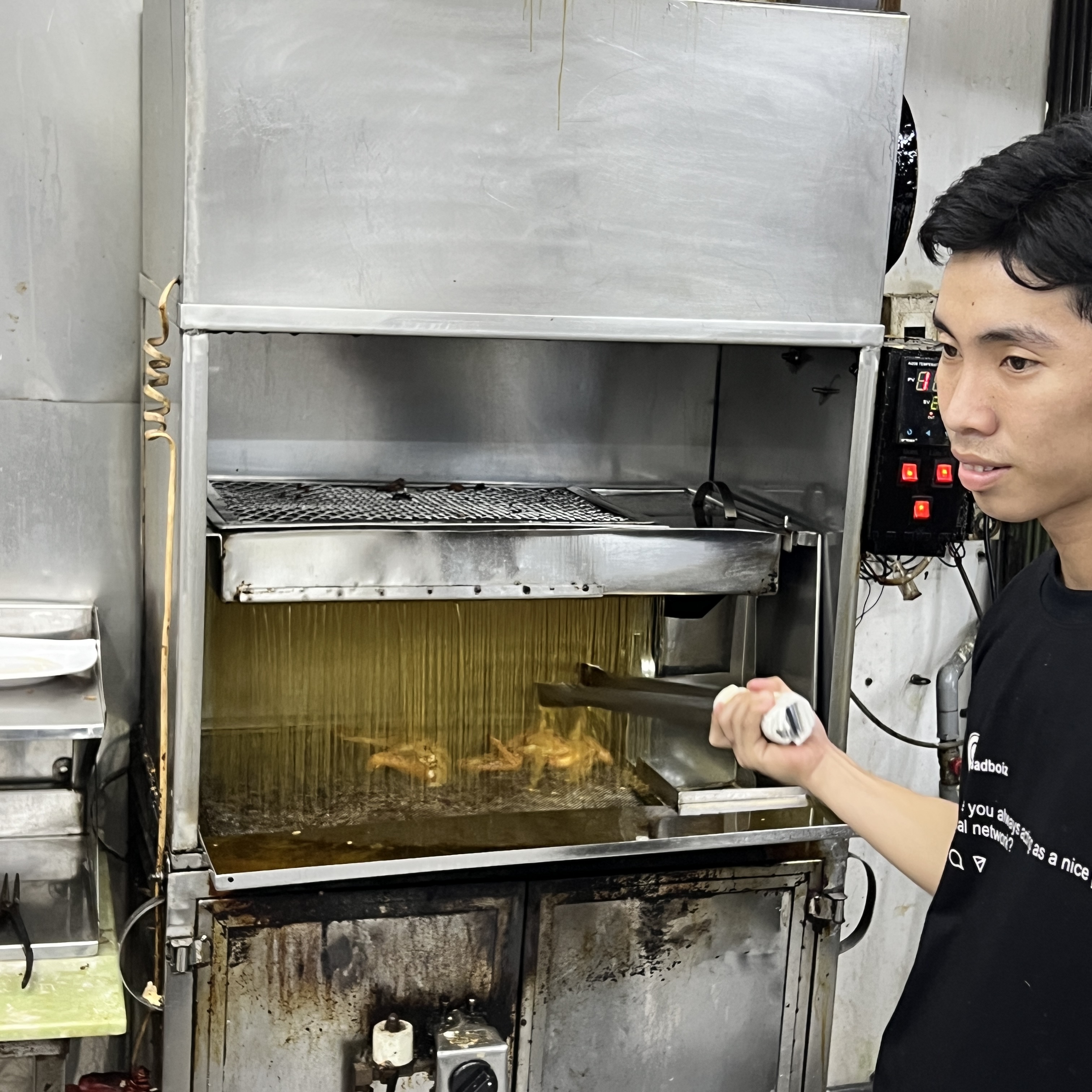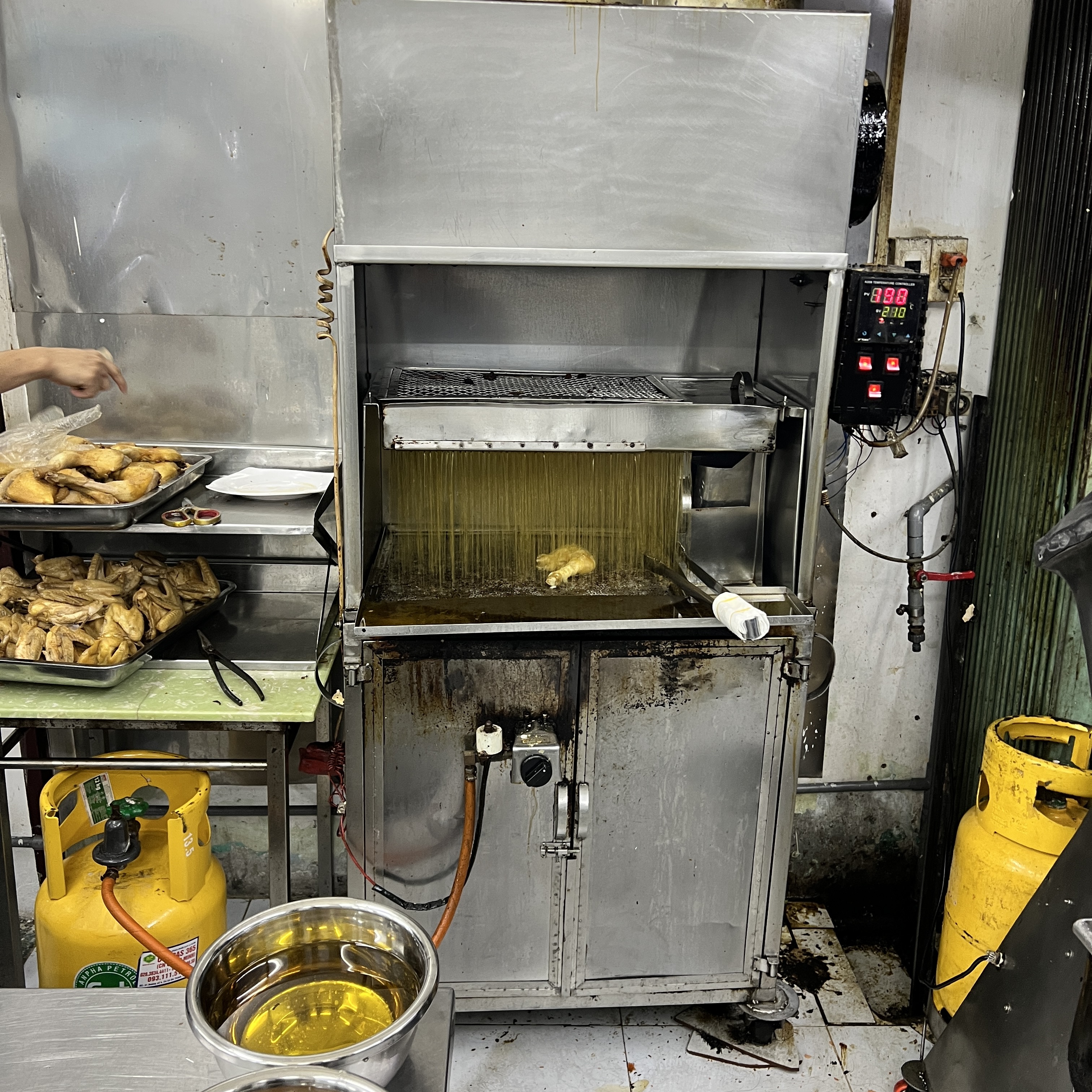 The owner has built a contraption that showers the chicken with hot oil to create a crispy chicken layer on the outside.
