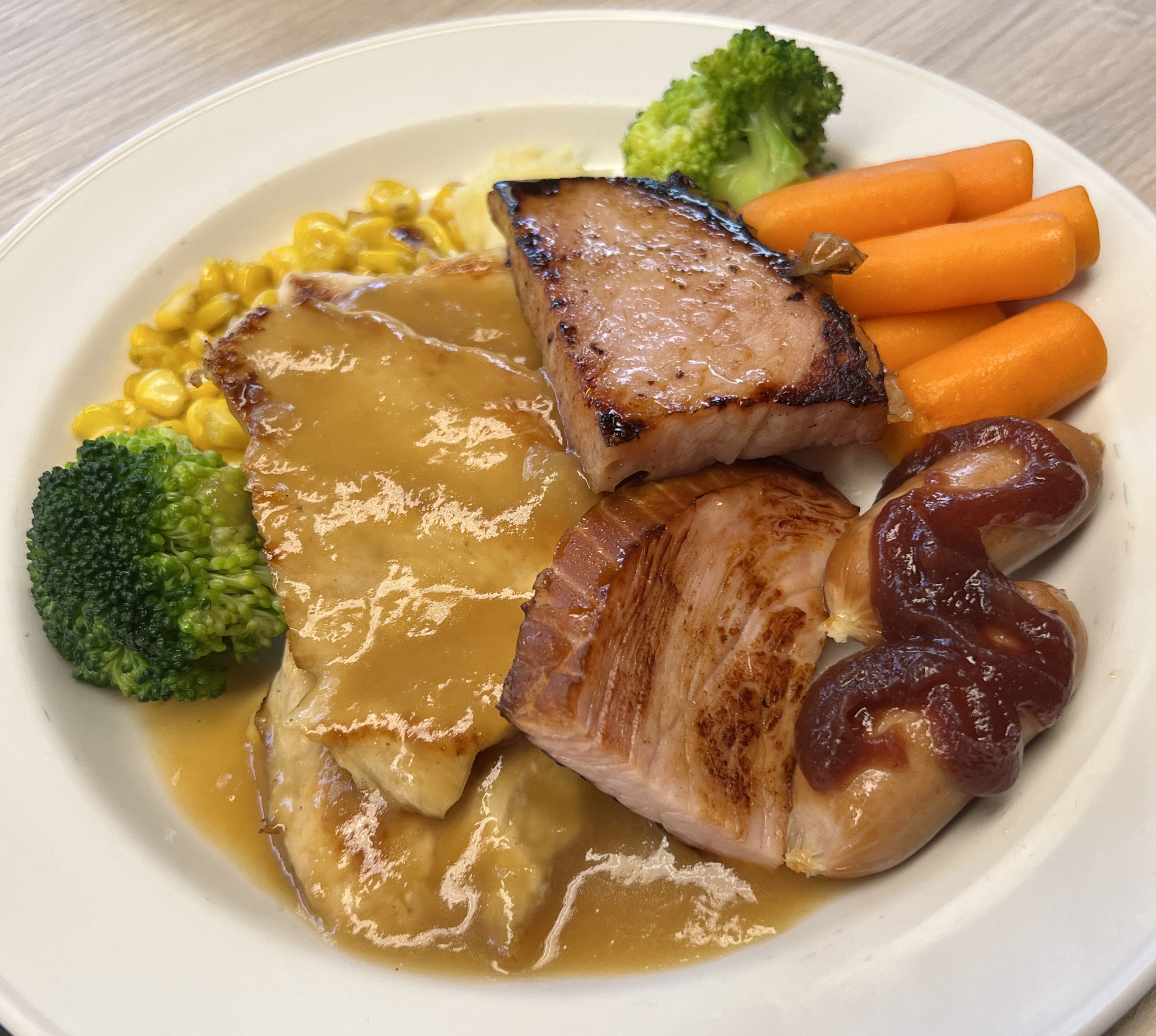 Turkey, Gammon Ham and Chipolata Sausages with Cranberry Sauce, with Mashed Potatoes, Corn and Broccoli.