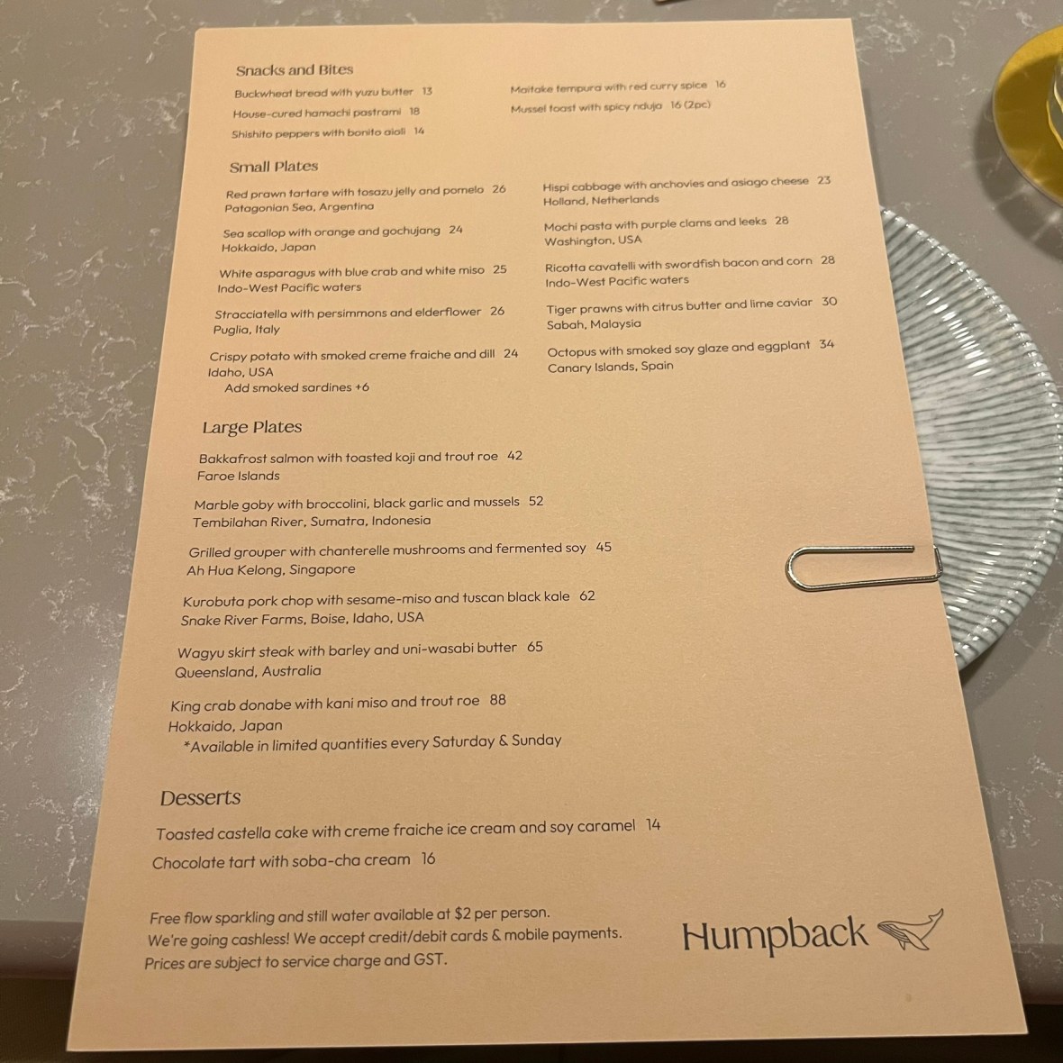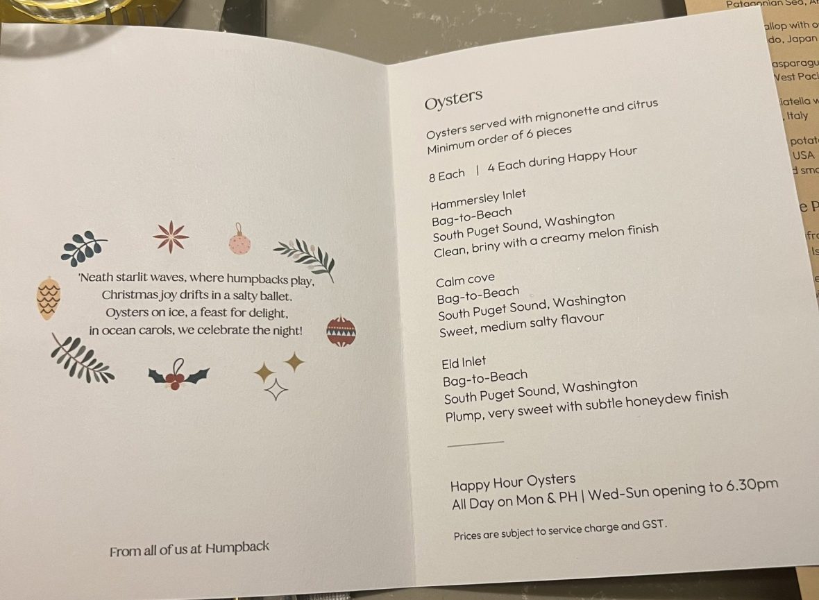 When we moved back to Singapore from Seattle, one of the first places we went to eat was Humpback because we loved the fact that that they specifically had oysters from Washington. We went back again on Christmas Day.