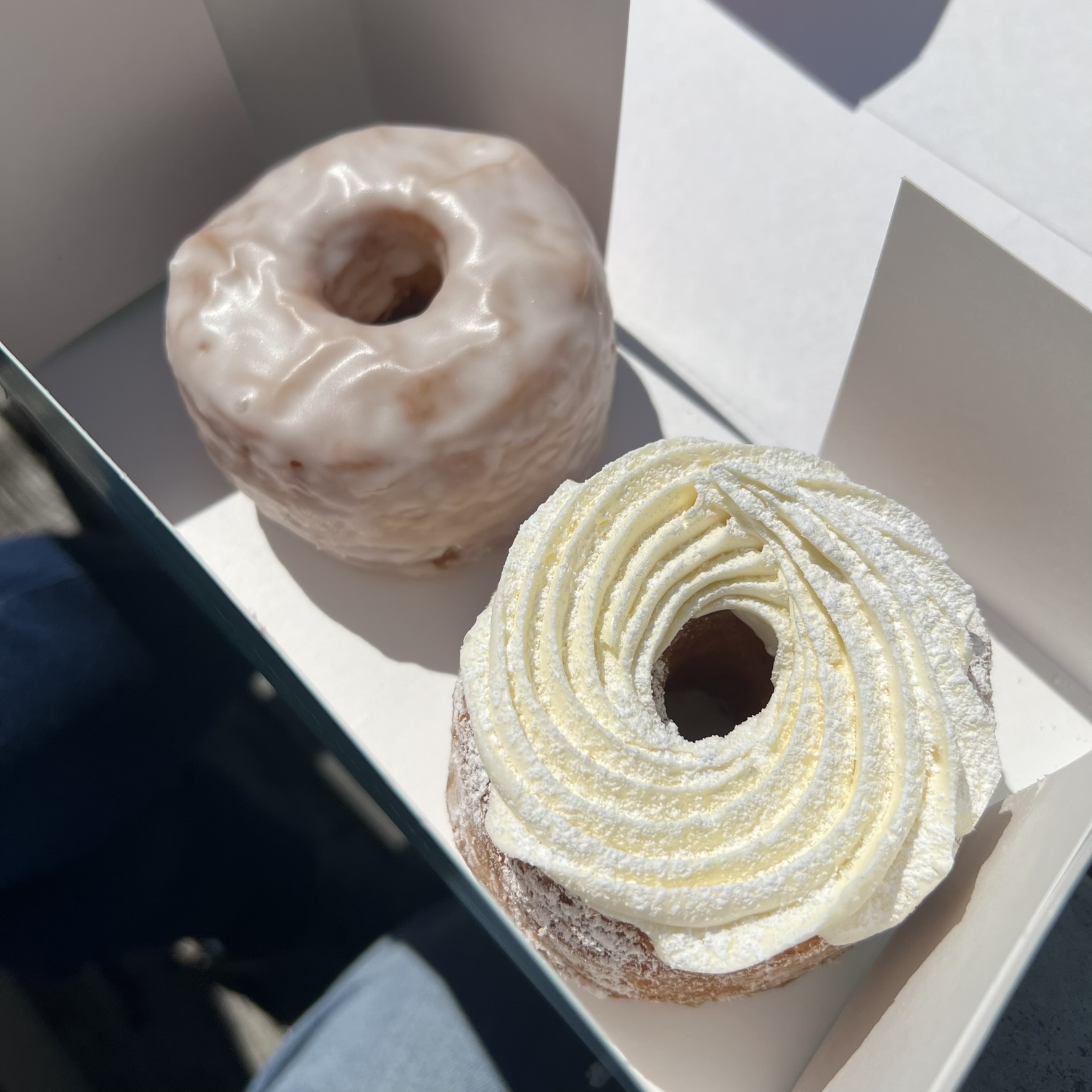 The donuts are made by layered croissant-type dough and then frosted and/or filled.
