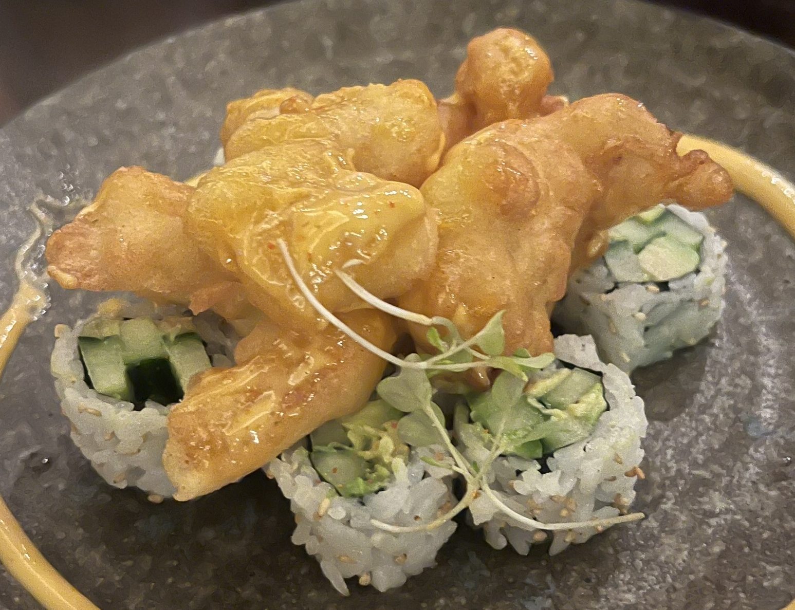 Strange – Prawn Tempura on top of a Cucumber Roll. A sort of Scallop Roll with Soft Shell Crab.