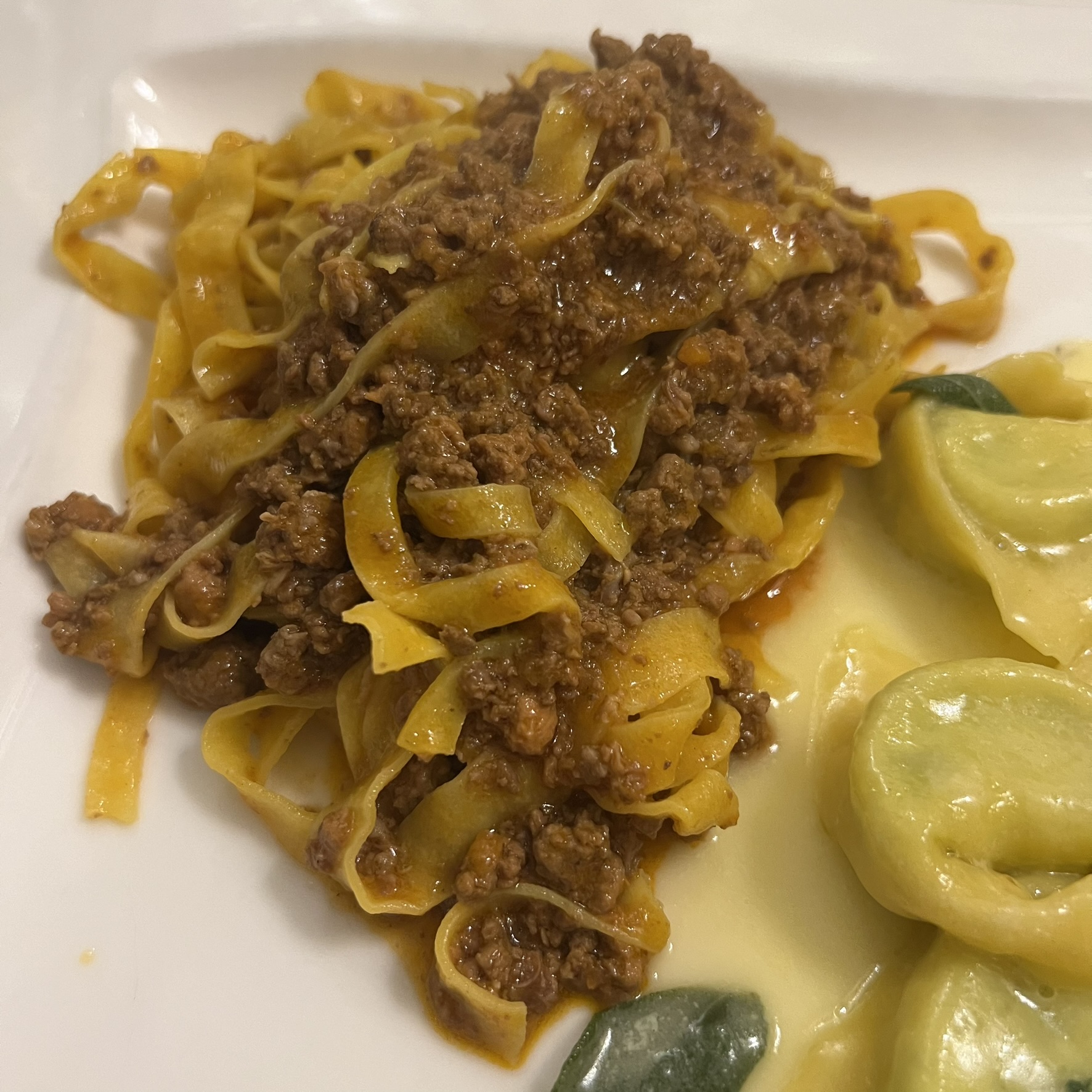 Taglietelle Ragu Bolognese and Tortellini Ripieni di Ricotta e spinaci.