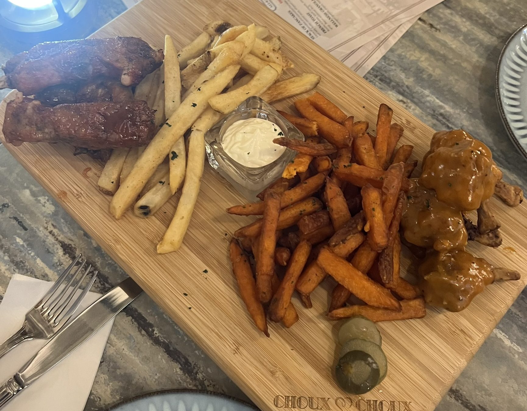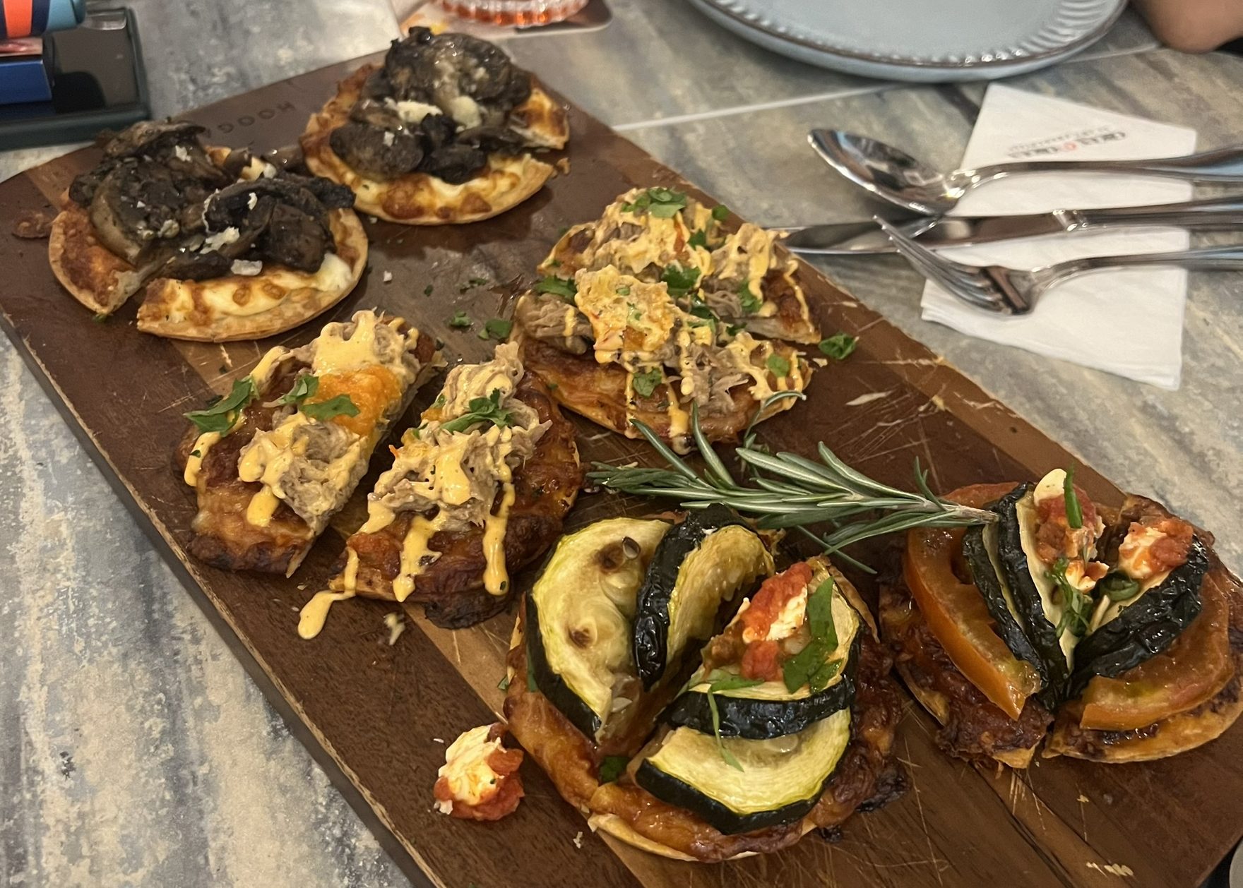 A Madeline as a starter, followed by a variety of small bites that included Tarts, Dips, Breads, Wings, Fried Things and Salad. All fresh.
